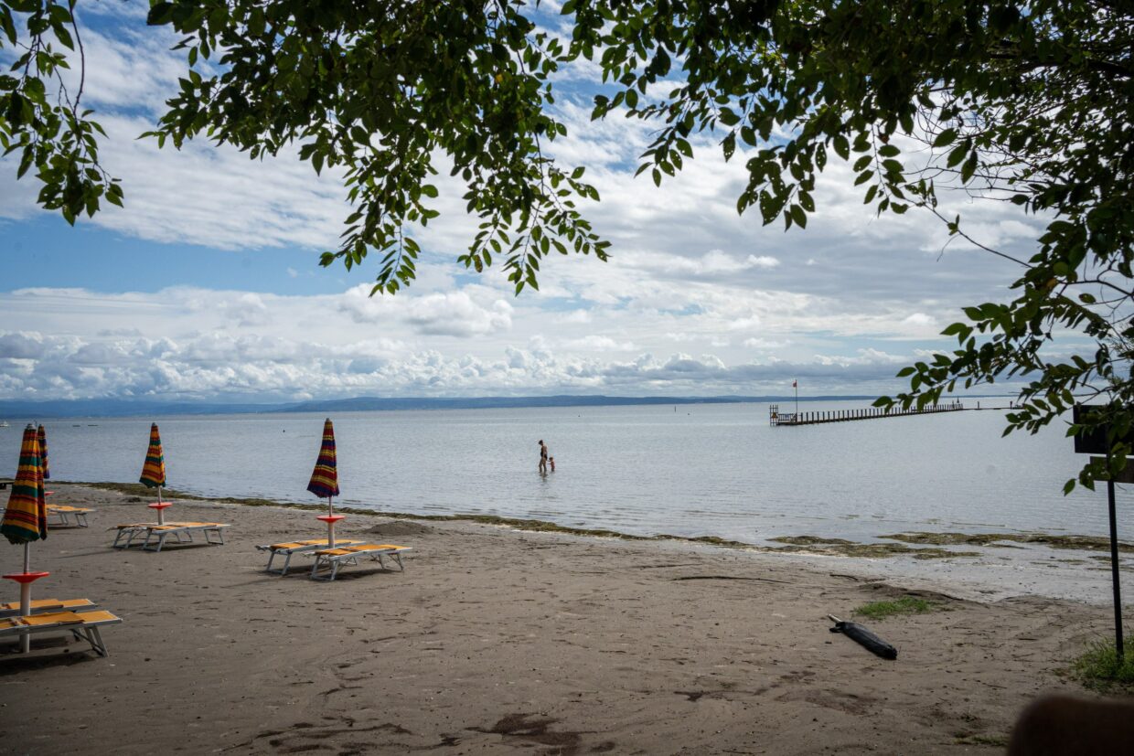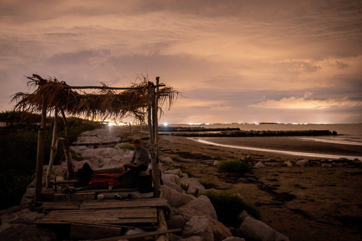 Wir fanden ein hübsches Plateau mit Palmendach am Strand, das sich bestens eignete – außer es würde regnen, dann müssten wir etwas mit der Plane improvisieren. Doch das Regenradar sah mal wieder harmlos aus und das Wetterleuchten unbedenklich. Der Sturm, der dann aus dem Nichts auftauchte, übertraf den in Grado vielleicht nicht ganz in den Wassermengen, aber definitiv in seiner Windstärke. Die gut gespannte Plane 30cm über uns mussten wir dennoch über eine Stunde mit Händen und Füßen festhalten, damit uns der Regen nicht komplett ins Bett gedrückt wird. Wie durch ein Wunder blieb der Schlafsack, den wir schützend zwischen uns aufbewahrt haben, relativ trocken, während wir klatschnass vor Kälte zitternd ausharrten und hofften, dass die Abstände von Blitz und Donner nicht noch enger wurden. Anderthalb Stunden später wagten wir uns aus der Deckung hervor. Ein warmer Meereswind hauchte uns wieder Energie ein. Doch den Rest der Nacht dort zu verbringen, war nicht vorstellbar – zumal weitere Schauer vorausgesagt waren. Aus Mangel an Alternativen bauten wir uns einen Unterschlupf in der 200m weiter entfernten mit Tischen ausgestatteten Strandhütte, wo wir endlich unseren Schlaf fanden.