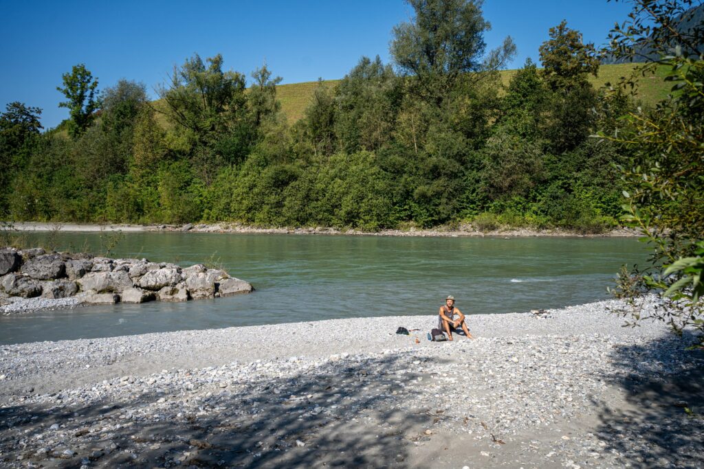 Beginn der Tour war Salzburg, wo es nach einem langen, aber wenig erholsamen Schlaf im Flixbus um 10 Uhr auf die Räder ging. Ein Großteil der Strecke verlief entlang der Salzach, die uns immer tiefer in die Berge führte. Der Weg ging stetig bergauf, was mit dem Zusatzgepäck – auch wenn es nur wenig war – ordentlich auf die Muskeln ging. Bei den ersten Hügeln mussten wir uns noch vergewissern, ob nicht die Räder einen Widerstand haben, doch mit der Zeit gewöhnten wir uns daran. Die kurzen Passagen, an denen es bergab ging, waren dafür umso schneller. Nach 66km suchten wir uns ein Waldstück in Flussnähe, wo wir übernachten konnten. Ein Blick zurück zeigt in der Ferne die erste Bergkette, die wir seit Salzburg durchquert haben. Am nächsten Morgen gab es dann Frühstück an der eiskalten Salzach.