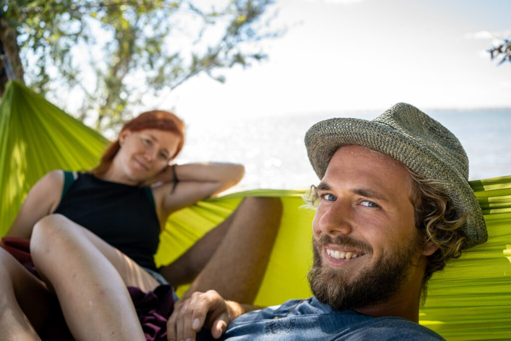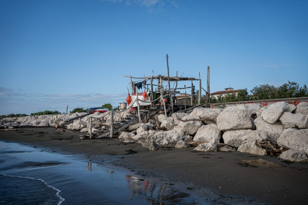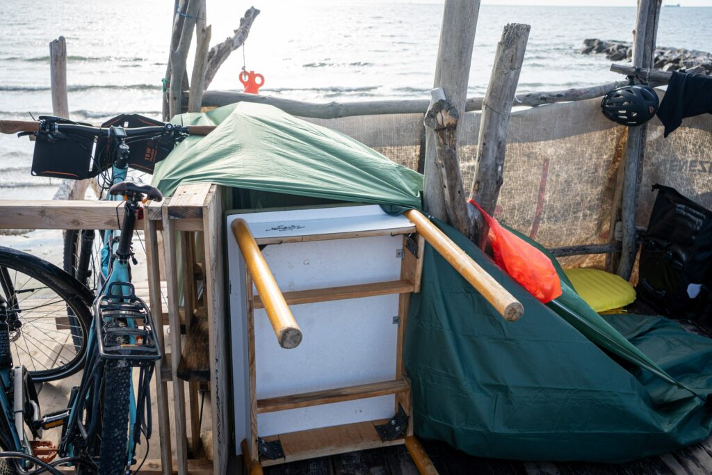 Wir fanden ein hübsches Plateau mit Palmendach am Strand, das sich bestens eignete – außer es würde regnen, dann müssten wir etwas mit der Plane improvisieren. Doch das Regenradar sah mal wieder harmlos aus und das Wetterleuchten unbedenklich. Der Sturm, der dann aus dem Nichts auftauchte, übertraf den in Grado vielleicht nicht ganz in den Wassermengen, aber definitiv in seiner Windstärke. Die gut gespannte Plane 30cm über uns mussten wir dennoch über eine Stunde mit Händen und Füßen festhalten, damit uns der Regen nicht komplett ins Bett gedrückt wird. Wie durch ein Wunder blieb der Schlafsack, den wir schützend zwischen uns aufbewahrt haben, relativ trocken, während wir klatschnass vor Kälte zitternd ausharrten und hofften, dass die Abstände von Blitz und Donner nicht noch enger wurden. Anderthalb Stunden später wagten wir uns aus der Deckung hervor. Ein warmer Meereswind hauchte uns wieder Energie ein. Doch den Rest der Nacht dort zu verbringen, war nicht vorstellbar – zumal weitere Schauer vorausgesagt waren. Aus Mangel an Alternativen bauten wir uns einen Unterschlupf in der 200m weiter entfernten mit Tischen ausgestatteten Strandhütte, wo wir endlich unseren Schlaf fanden.