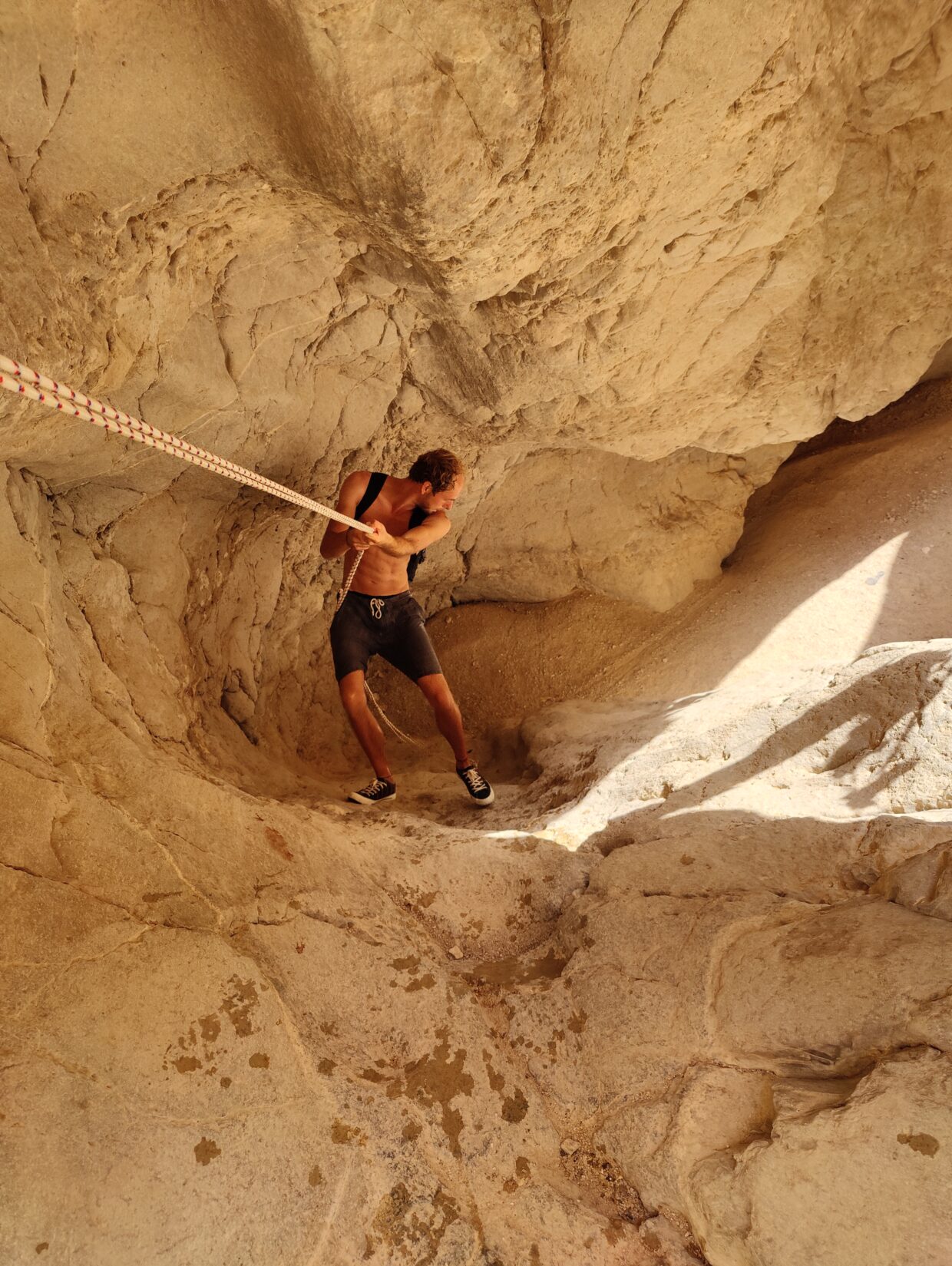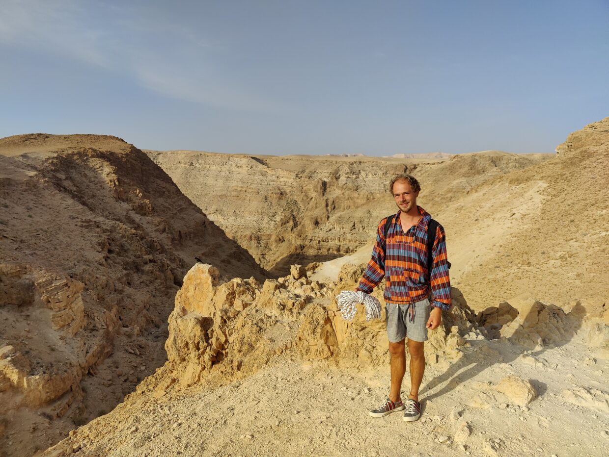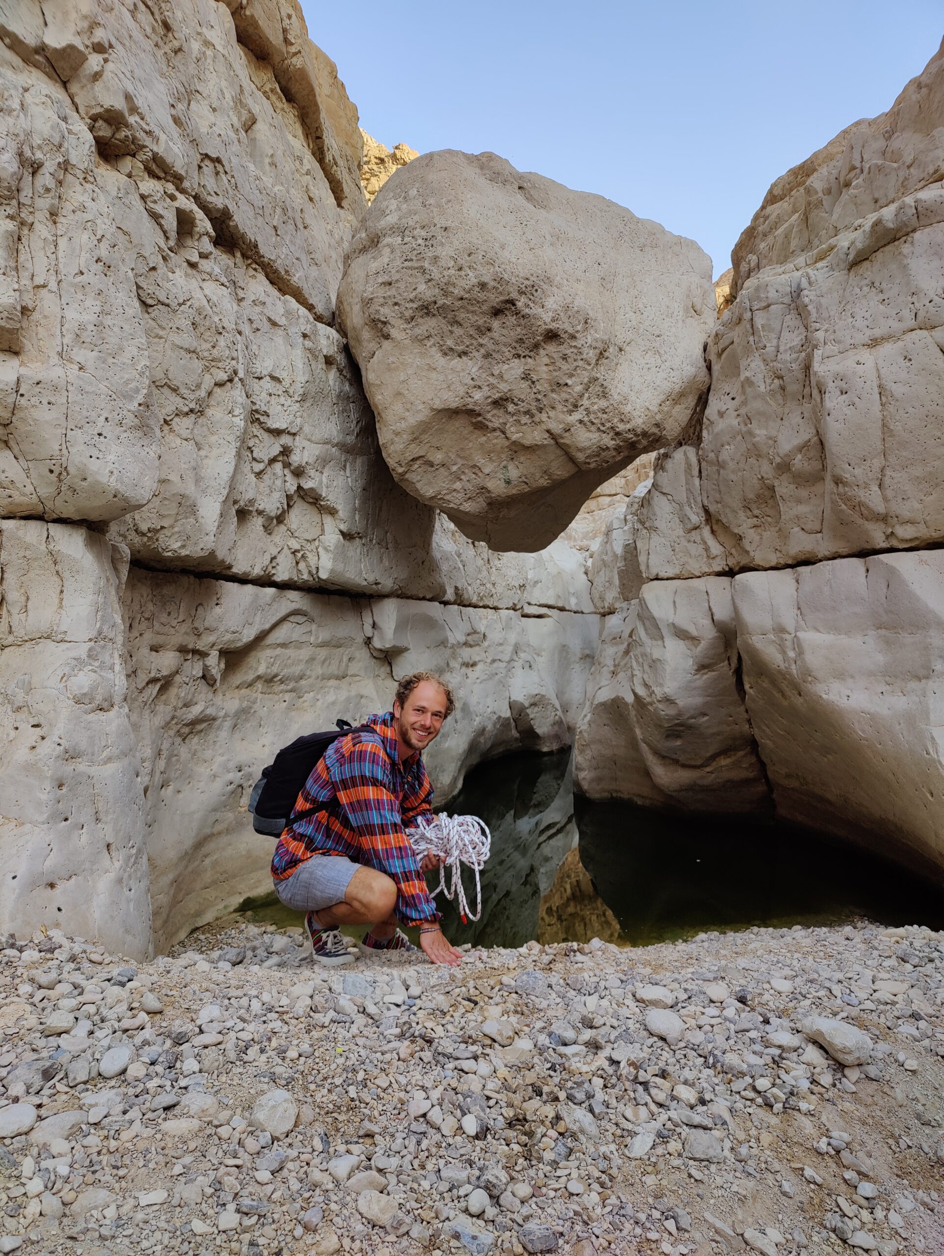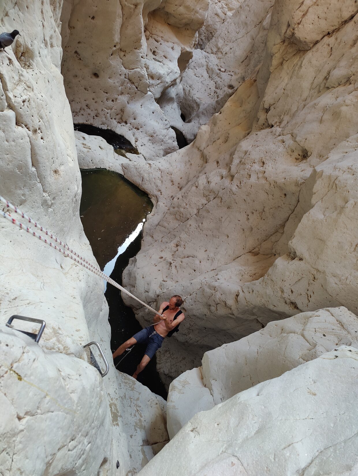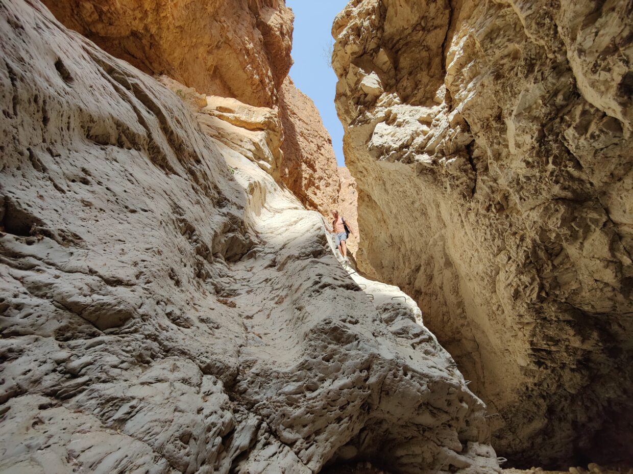 Als stolze Besitzer eines Seiles machten wir uns auf einen abenteuerlichen Weg zum tiefsten Punkt der Erde. Wir schlugen unser Zelt am Abend zuvor in der Nähe von Metsoge Dragot auf, sodass wir den nächsten Tag genug Zeit hatten, die 400 Höhenmeter nach unten zu bewältigen. Die Infos, die man im Netz finden konnte, gaben einen 8 Stunden Weg an und man benötige ein 30m Seil und wasserfeste Taschen. Außerdem ist die Schlucht meist gesperrt, wegen der Gefahr von zu viel oder zu wenig Wasser. Das Phenomen von sogenannten flashfloods fordert jedes Jahr Tote, wenn es irgendwo in der Wüste regnet und sich das Wasser in Rinnsalen sammelt. Die ungehäure Kraft kann man sich gut vorstellen, wenn man die ausgehölten Steine betrachtet. Die Gefahr von zu wenig Wasser rührt daher, dass bei langanhaltenden Regenflauten die Becken im Canyon ein Bakterienparadies werden und bestialisch stinken. Wir hatten Glück, es roch nur wenig.