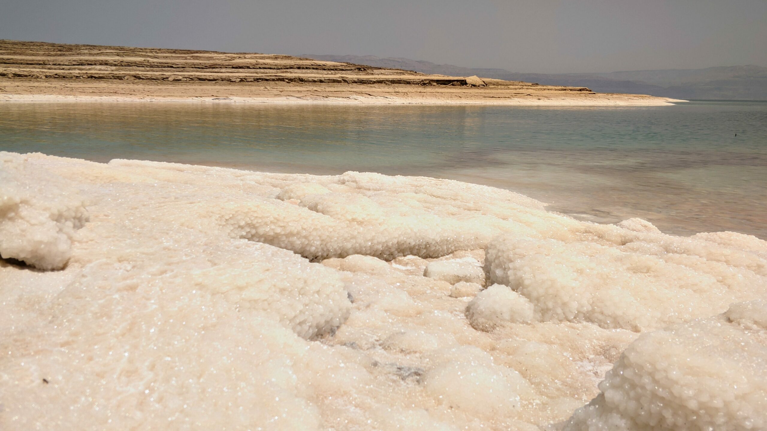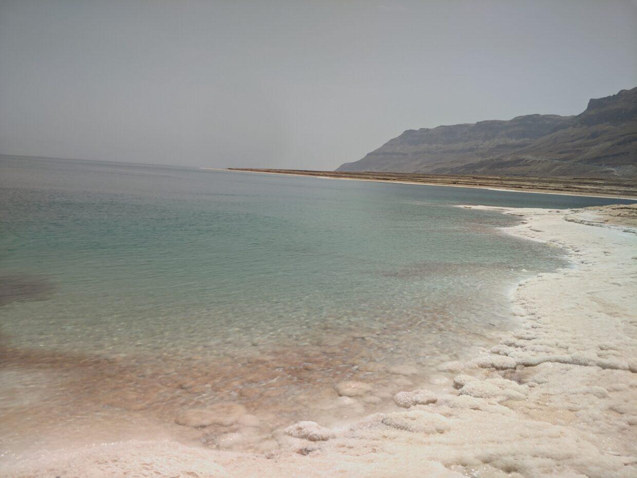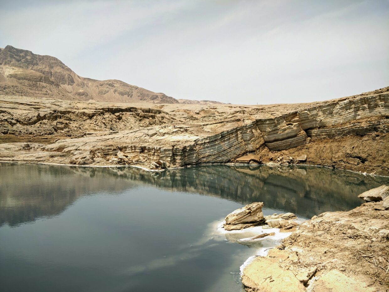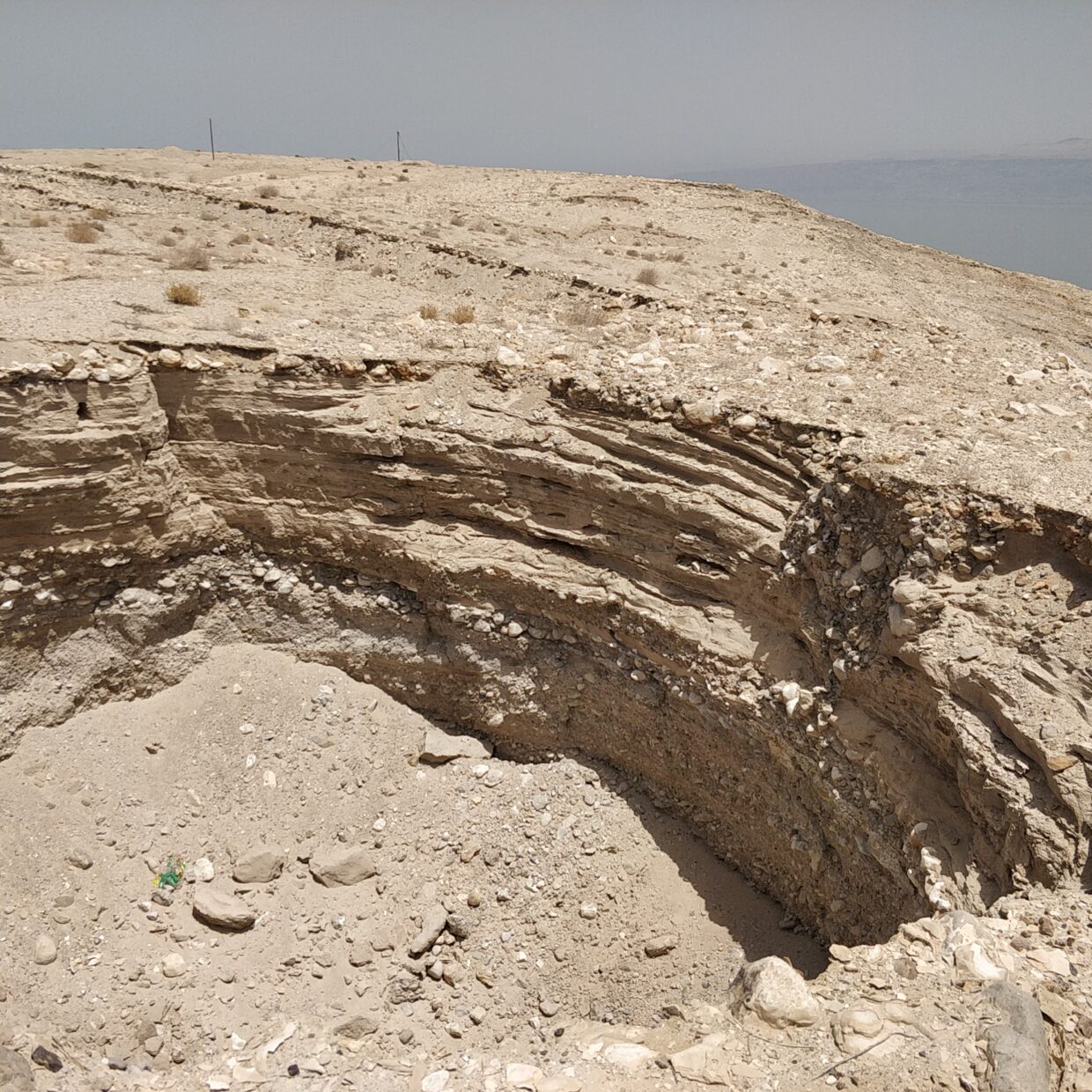 Wir sind einige Male nass und wieder trocken geworden und wären ohne Seil an manchen Stellen weder vor noch zurück gekommen. Doch nach 4 Stunden war der Abstieg leider schon vorbei und wir endeten an der Hauptstraße in einem weiten Steindelta. Nelson entschloss sich, den letzten Bus nach Norden zu erwischen, gab mir sein leztes Wasser und seine Powerbank, damit ich die Wanderung am Toten Meer vortsetzen kann. Ich weiß, dass es am Ufer manchmal Süßwasserquellen gibt und habe sogar einige heiße Quellen auf der Karte ausgemacht. Also stapfte ich bei brütender Hitze am Ufer des riesen Salzsees entlang und konnte mir einmal die großen Krater, die durch das Absinken des Grundwasserspiegels riesige Sinkholes in der Landschaft hinterlassen, aus der Nähe anschauen.
