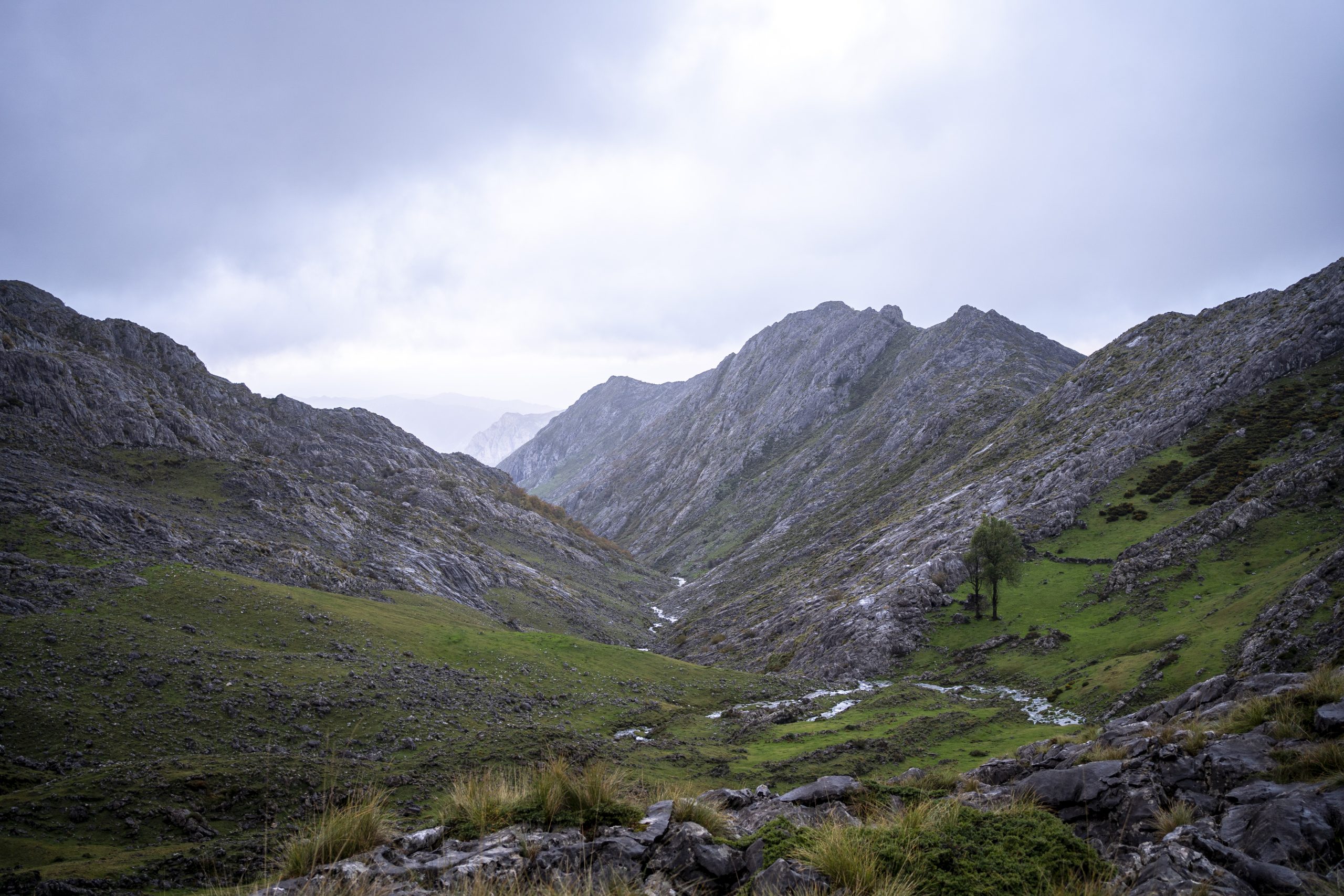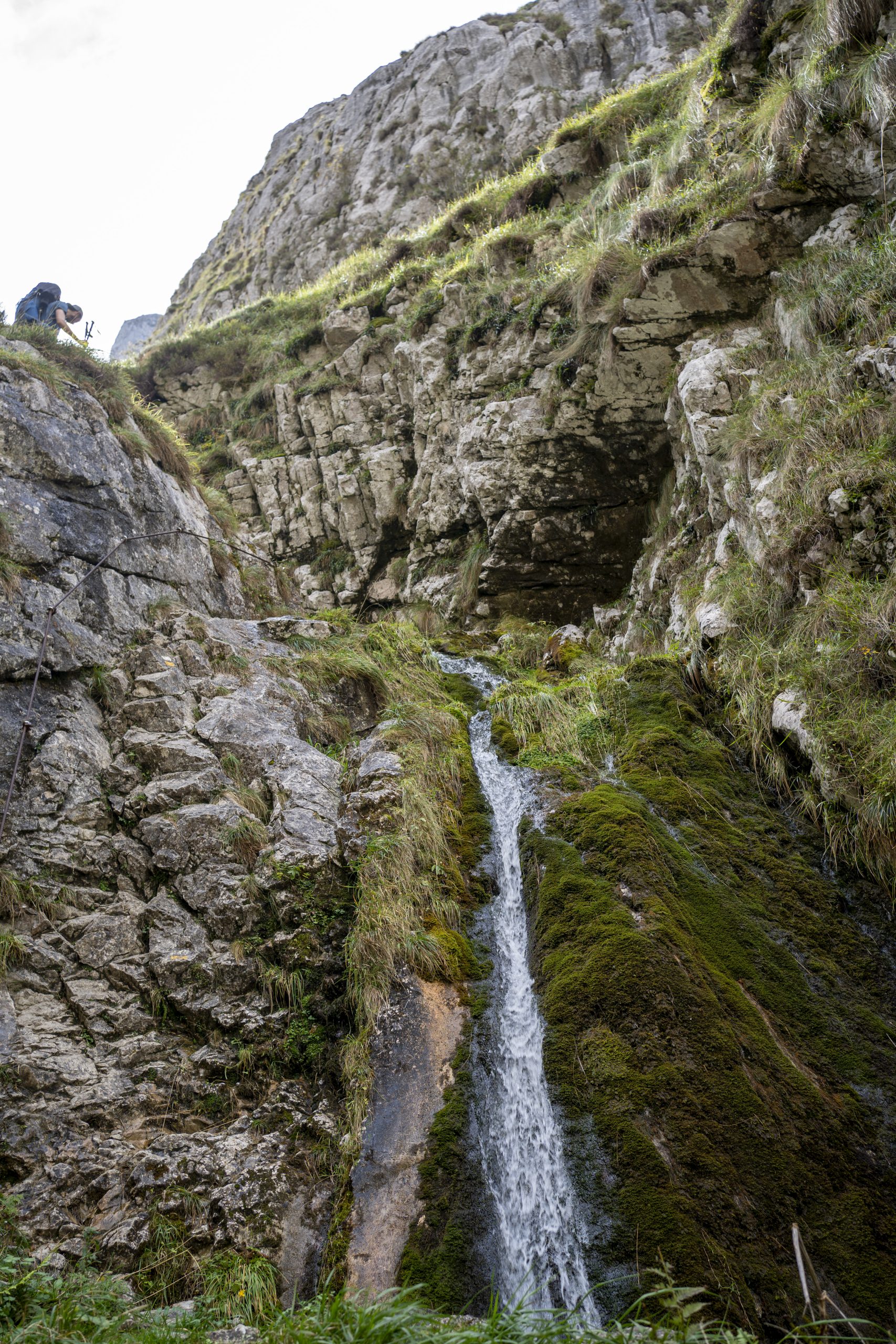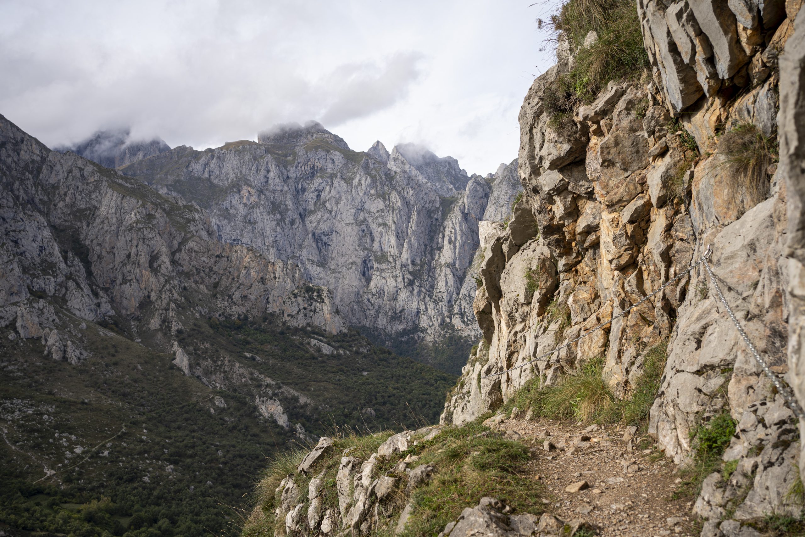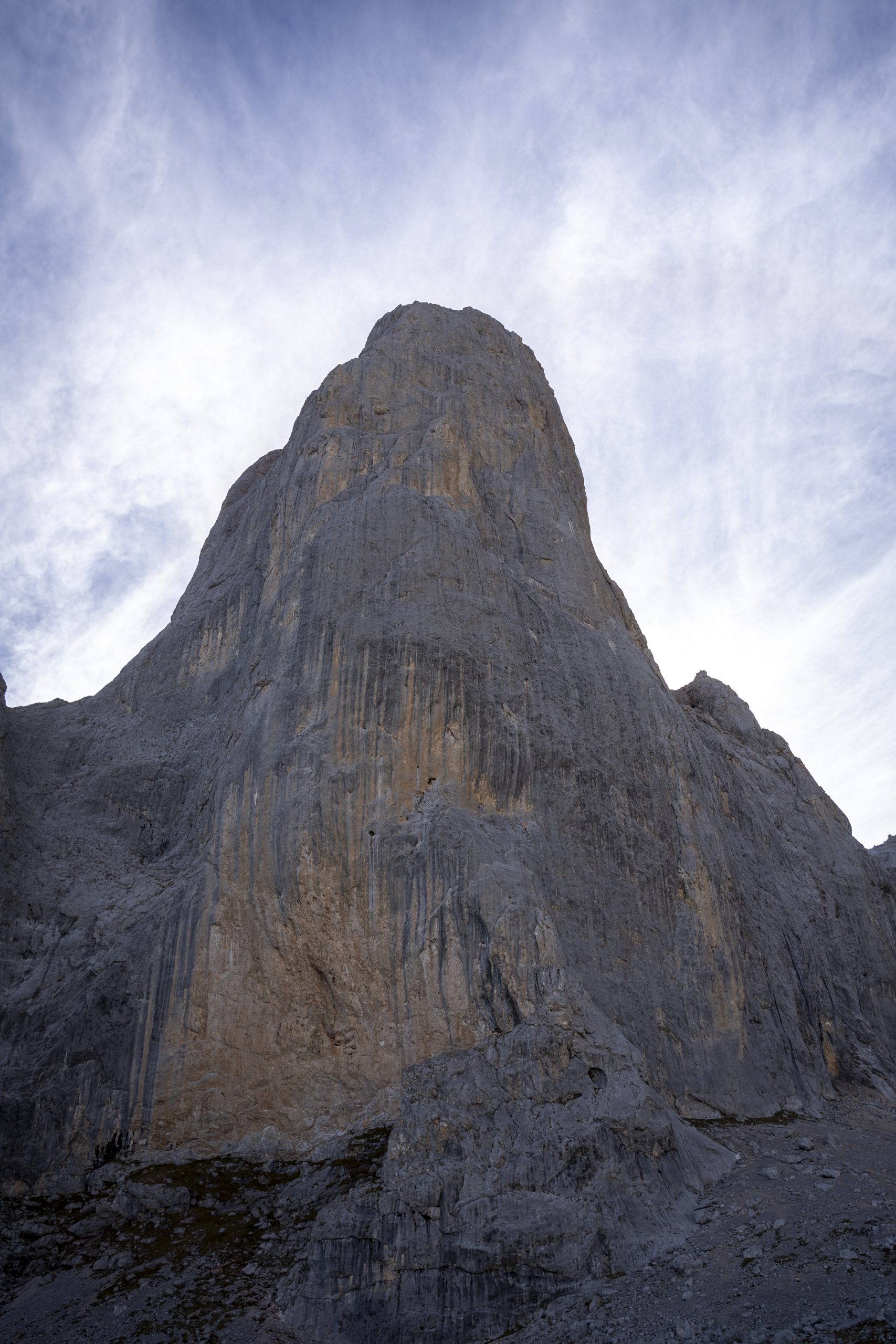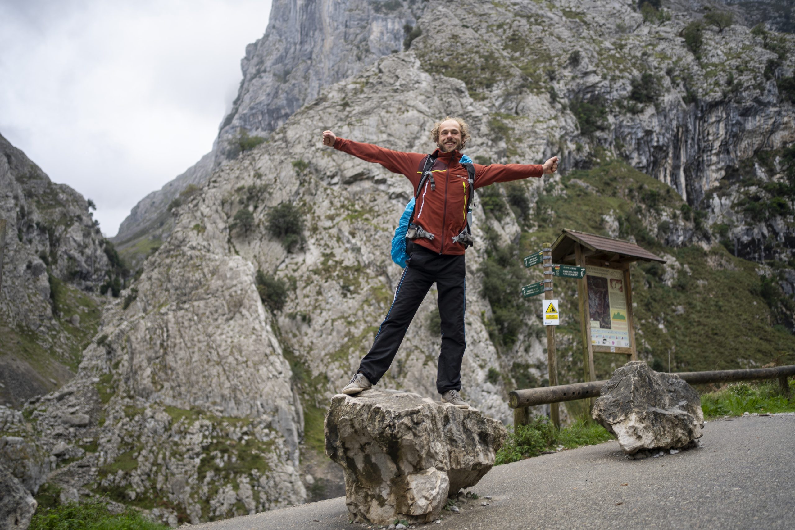 Nach diesen fantastischen Impressionen haben wir gefühlt alles gesehen und konnten zufrieden absteigen. Bloß 300 Höhenmeter aufwärts und 2400 abwärts trennten uns jetzt noch von dem Hostel in Poncebos, welches *spoiler* geschlossen hatte. Besonders in der ersten Stunde war der „Weg“ recht anspruchsvoll, jedenfalls wiesen darauf die Schilder hin, mit der Anmerkung, dass die Sicherungsseile entfernt werden mussten. Aber für erfahrene MOUNTAINGOATS wie uns, ist das gar kein Problem. Später ging es dann noch am Pico Urriellu, dem populärsten Berg der Region vorbei, der vor allem für Kletterer mit seinen zahlreichen Routen interessant ist. Ab da wurde es wieder grün und um die Bachläufe, denen wir 10km folgten, bedeckte Moos die Steine und die Atmosphäre war paradiesisch.