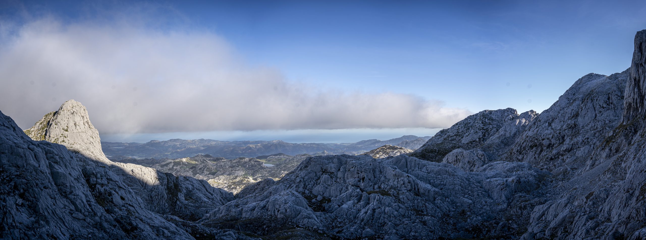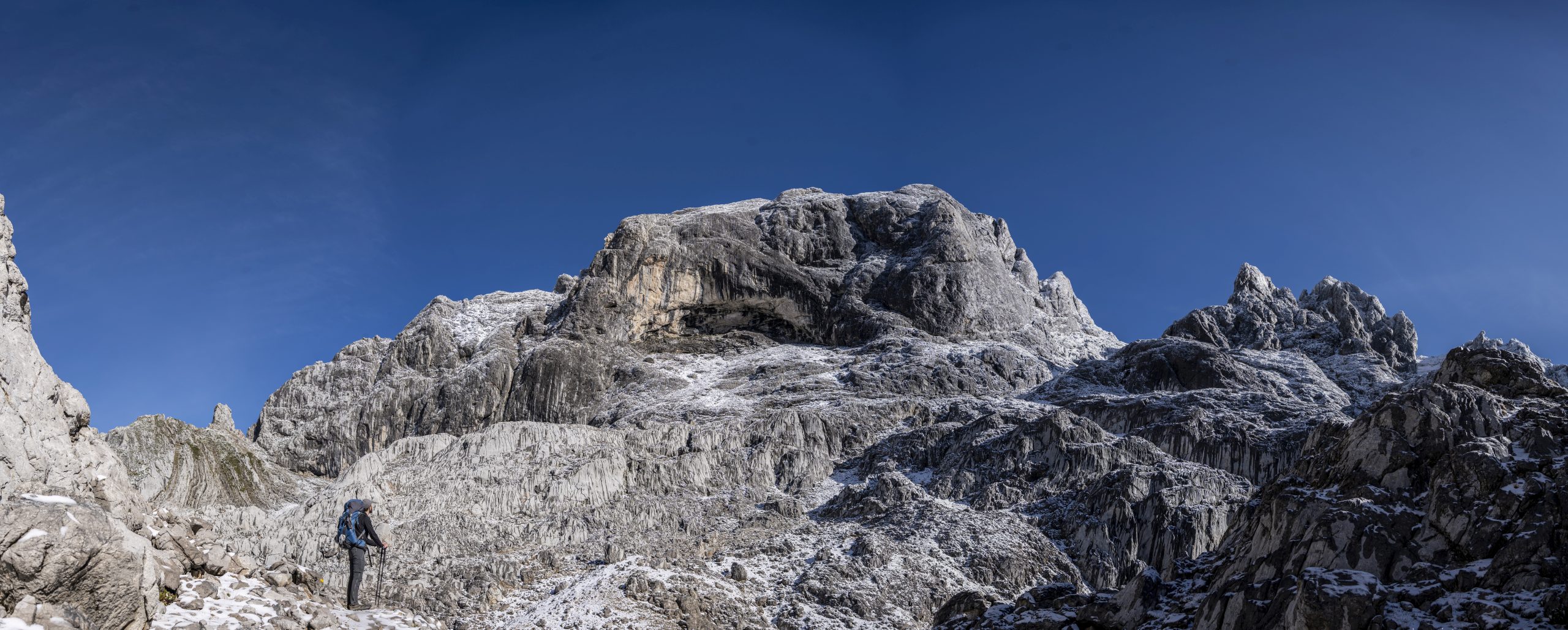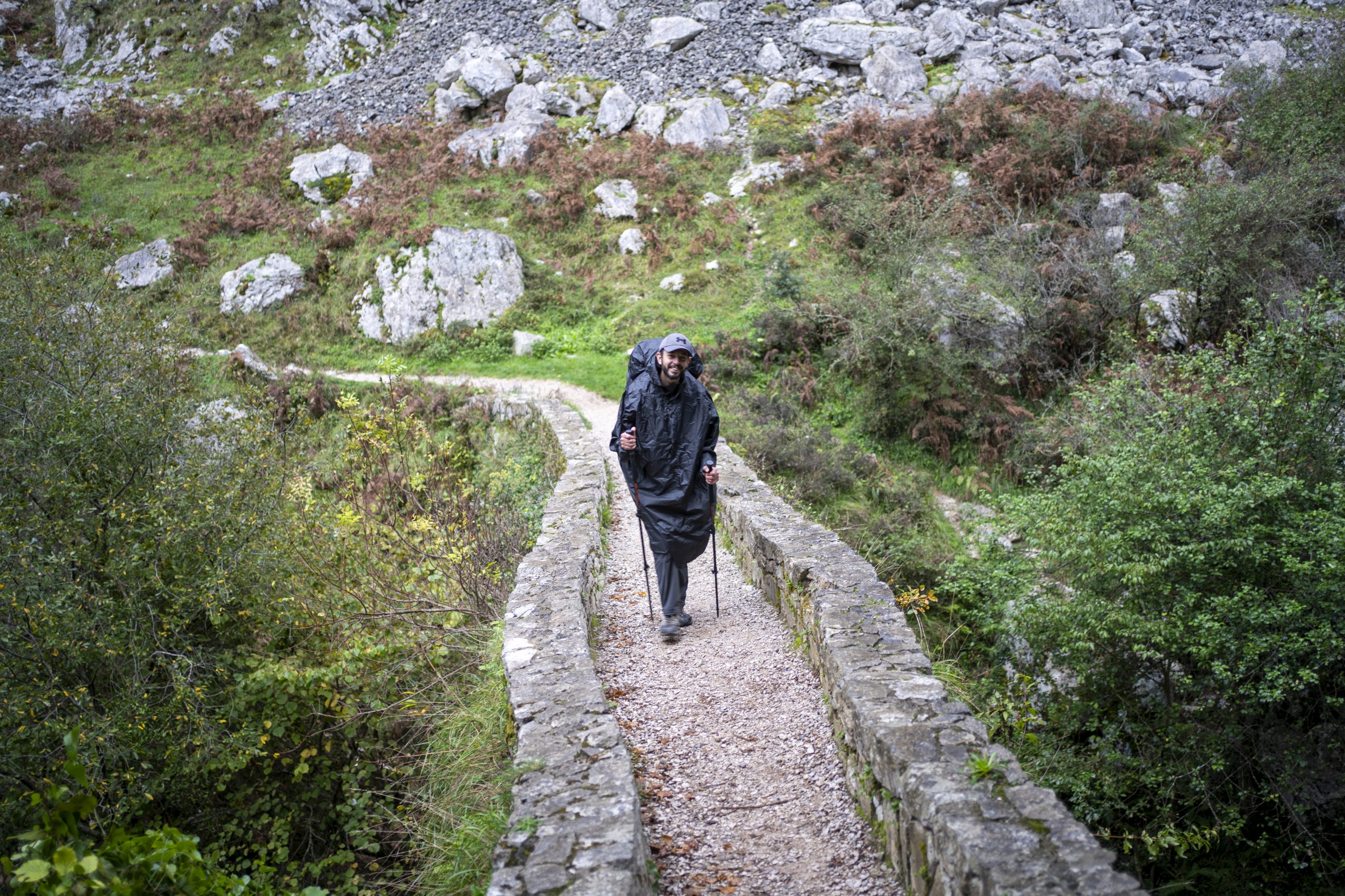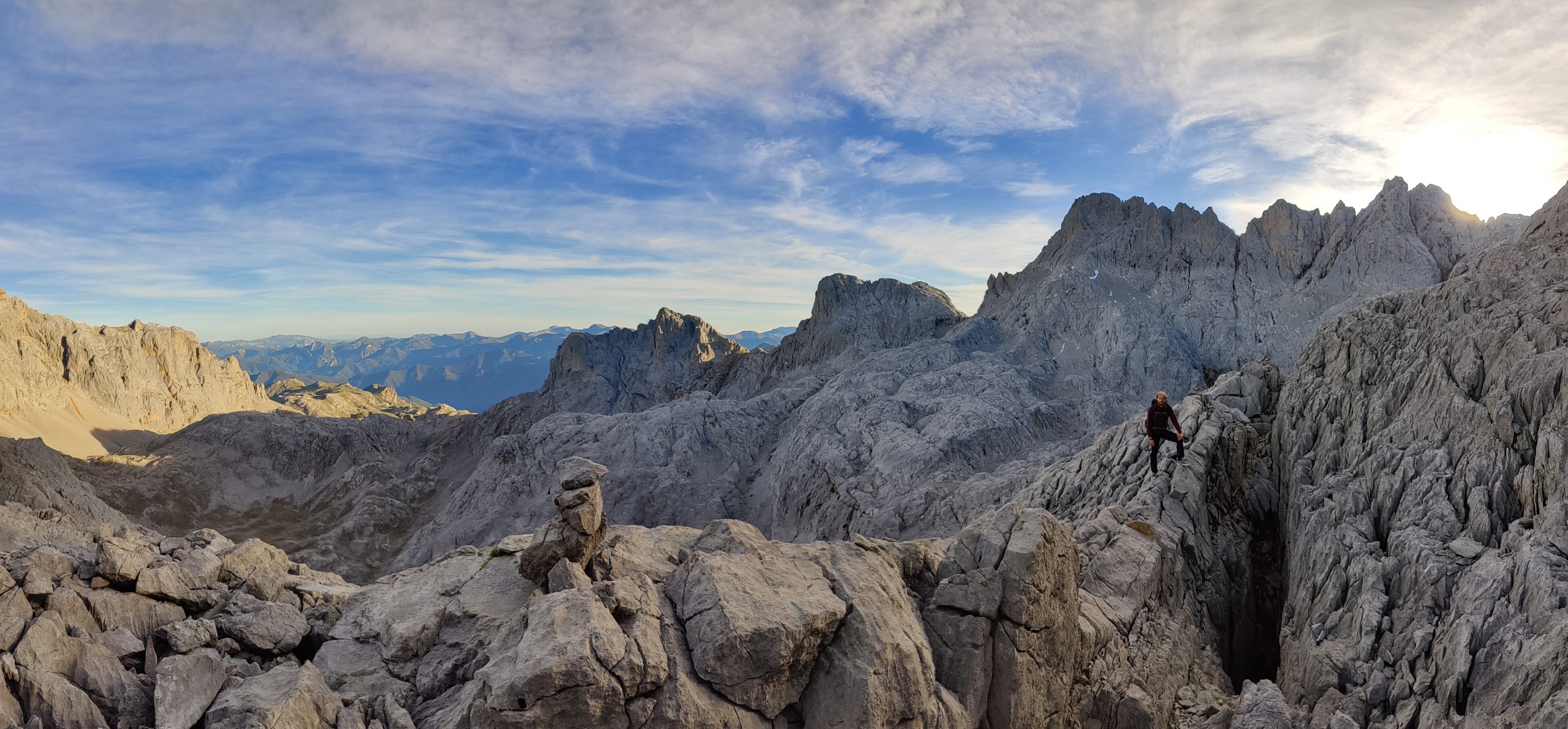 Nach diesen fantastischen Impressionen haben wir gefühlt alles gesehen und konnten zufrieden absteigen. Bloß 300 Höhenmeter aufwärts und 2400 abwärts trennten uns jetzt noch von dem Hostel in Poncebos, welches *spoiler* geschlossen hatte. Besonders in der ersten Stunde war der „Weg“ recht anspruchsvoll, jedenfalls wiesen darauf die Schilder hin, mit der Anmerkung, dass die Sicherungsseile entfernt werden mussten. Aber für erfahrene MOUNTAINGOATS wie uns, ist das gar kein Problem. Später ging es dann noch am Pico Urriellu, dem populärsten Berg der Region vorbei, der vor allem für Kletterer mit seinen zahlreichen Routen interessant ist. Ab da wurde es wieder grün und um die Bachläufe, denen wir 10km folgten, bedeckte Moos die Steine und die Atmosphäre war paradiesisch.
