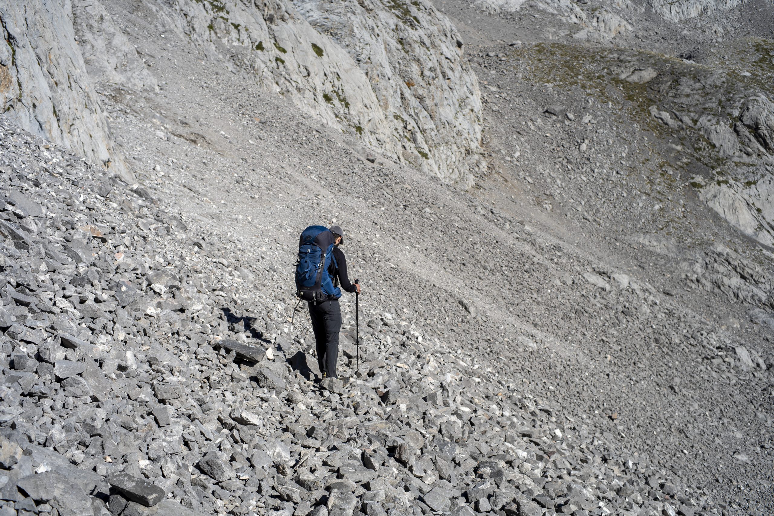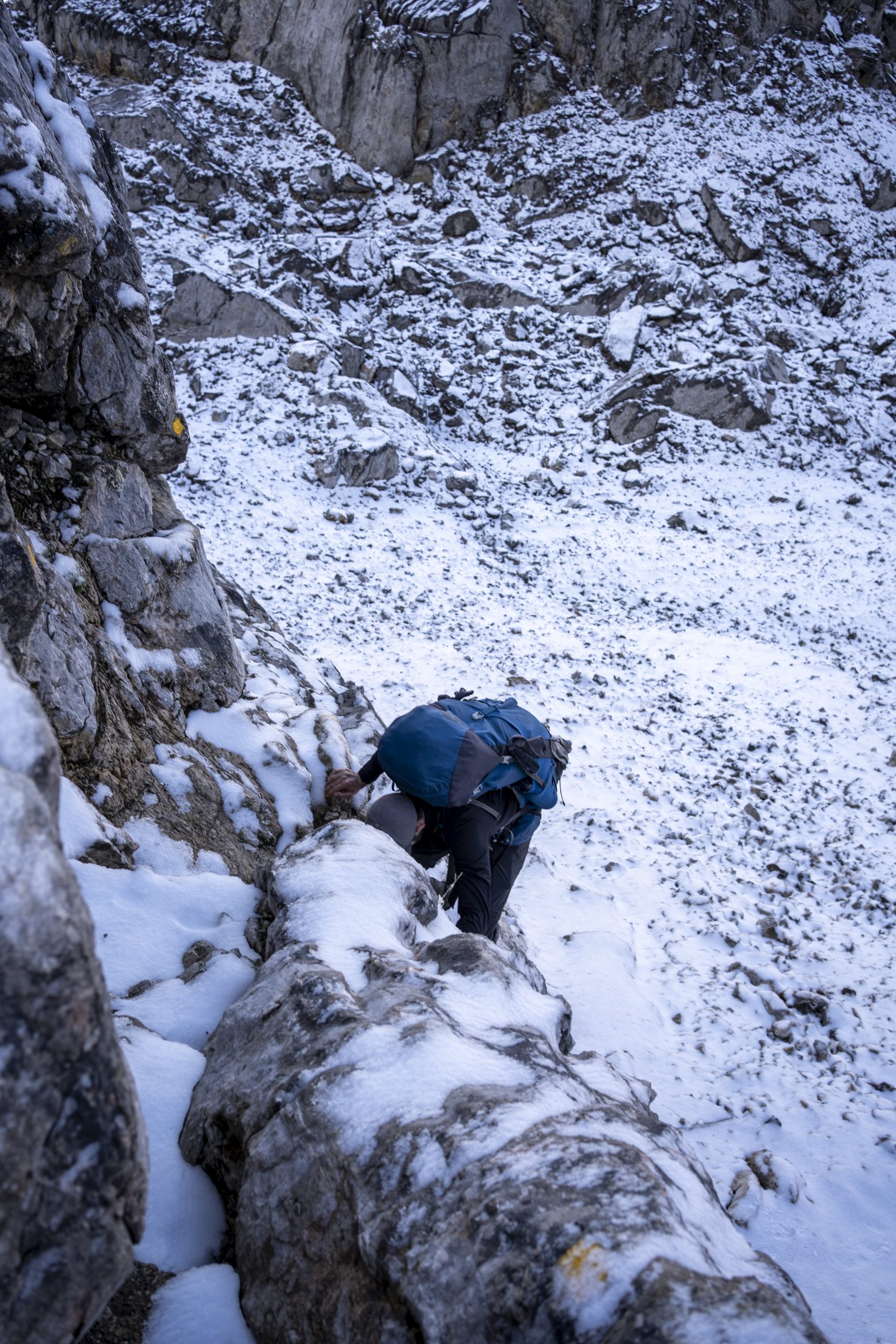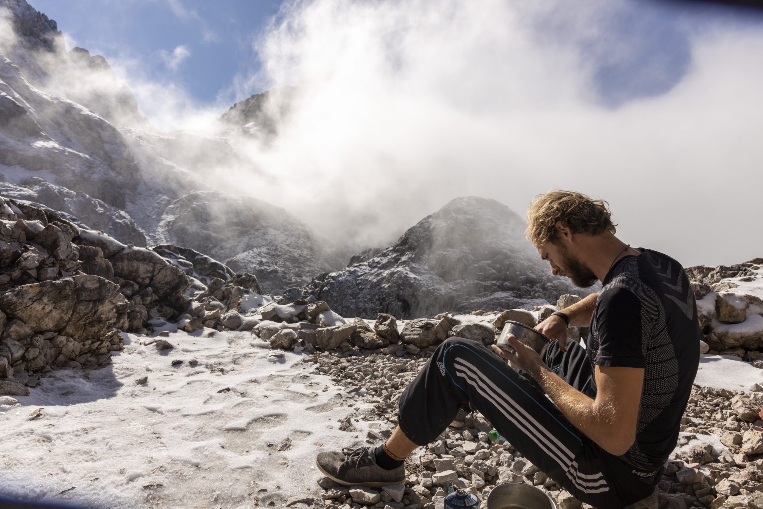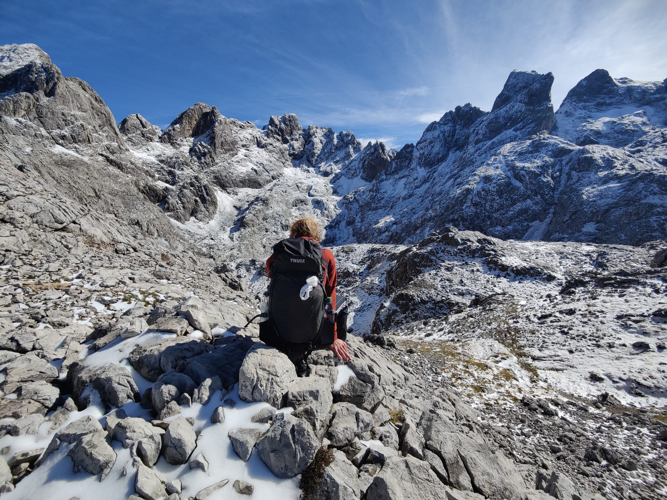 Am Morgen darauf wurden wir von klarer Sicht überrascht, die wir direkt ausnutzen wollten. Ohne Frühstück im Bauch ging es direkt 600m steil nach oben. Das Terrain wurde steiniger, die Plateaus, die noch grün waren, waren von kleinen Kratern übersäht, die aussahen, als wären die Wasserreservoirs und Tunnel im Berg sehr lebendig. Als dann irgendwann nur noch Stein und Eis zu sehen war, hatten wir glücklicherweise auch endlich eine Höhe erreicht, von der die Sonne zu sehen war. An einer Höhle war ein hübscher Ort für unser Porridge. Ein optimistischer Blick auf die Karte: Ab hier eigentlich keine Steigung mehr und nach 8km dann noch 1000 Höhenmeter nach unten. Doch was auf der Karte wie eine große Ebene aussieht, stellt sich bald als eine ziemlich anstrengende Kletter-Wanderung heraus.