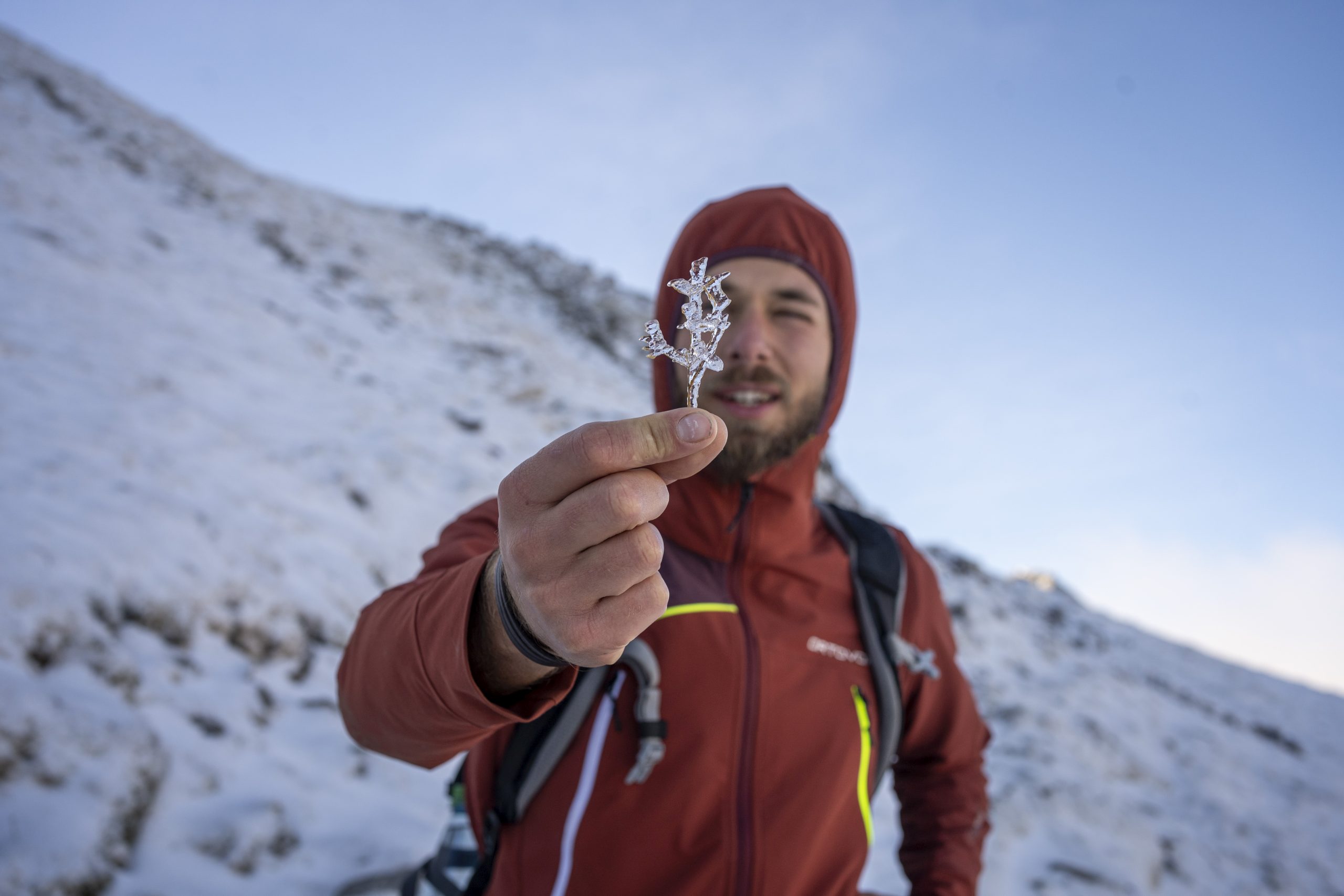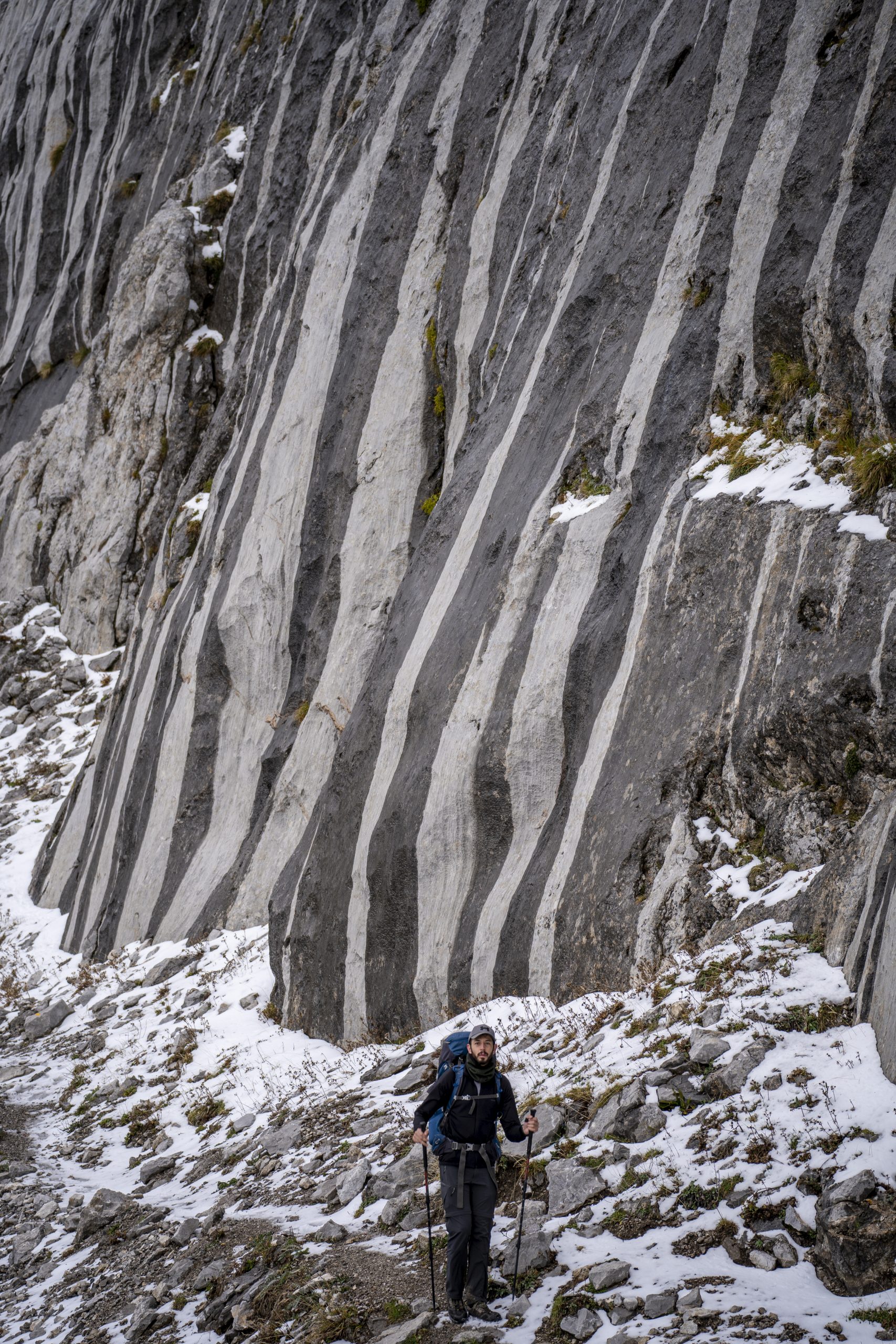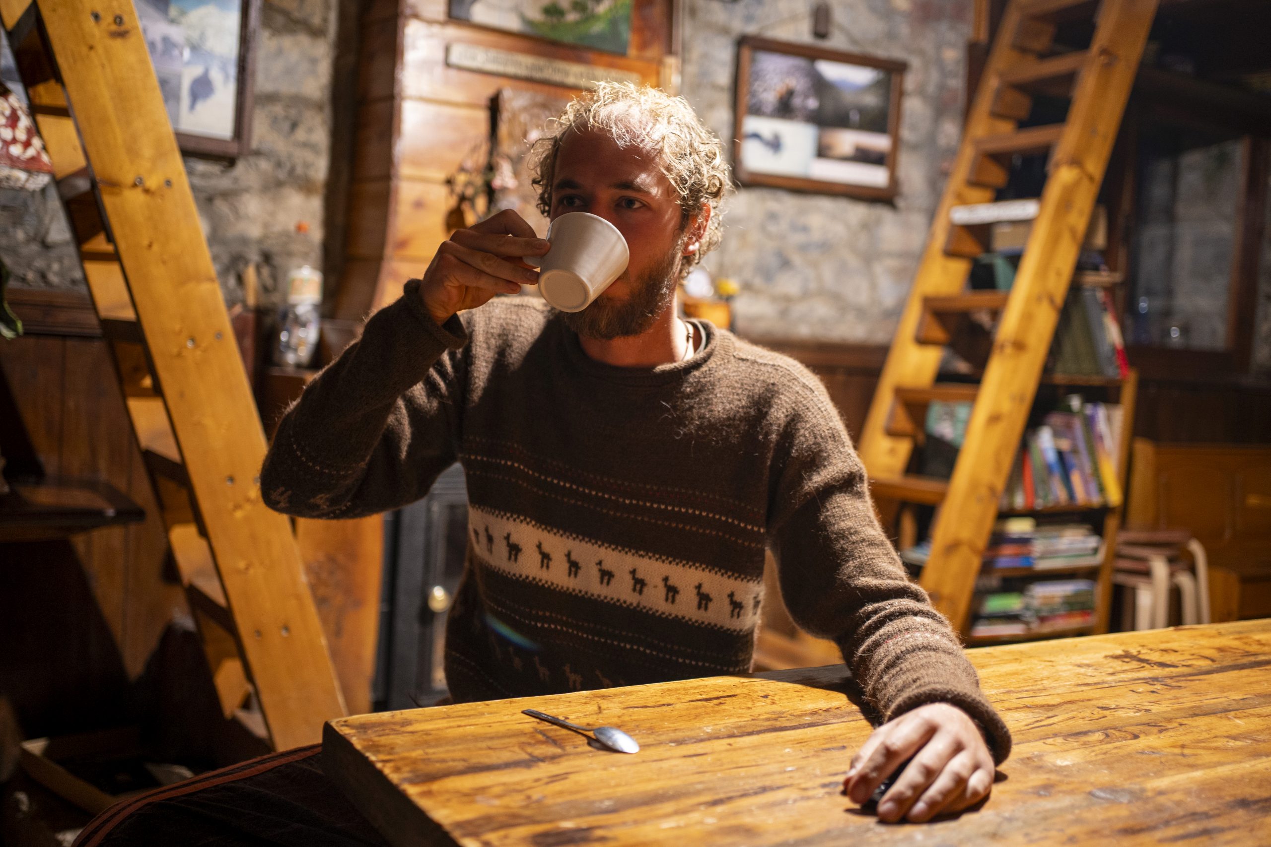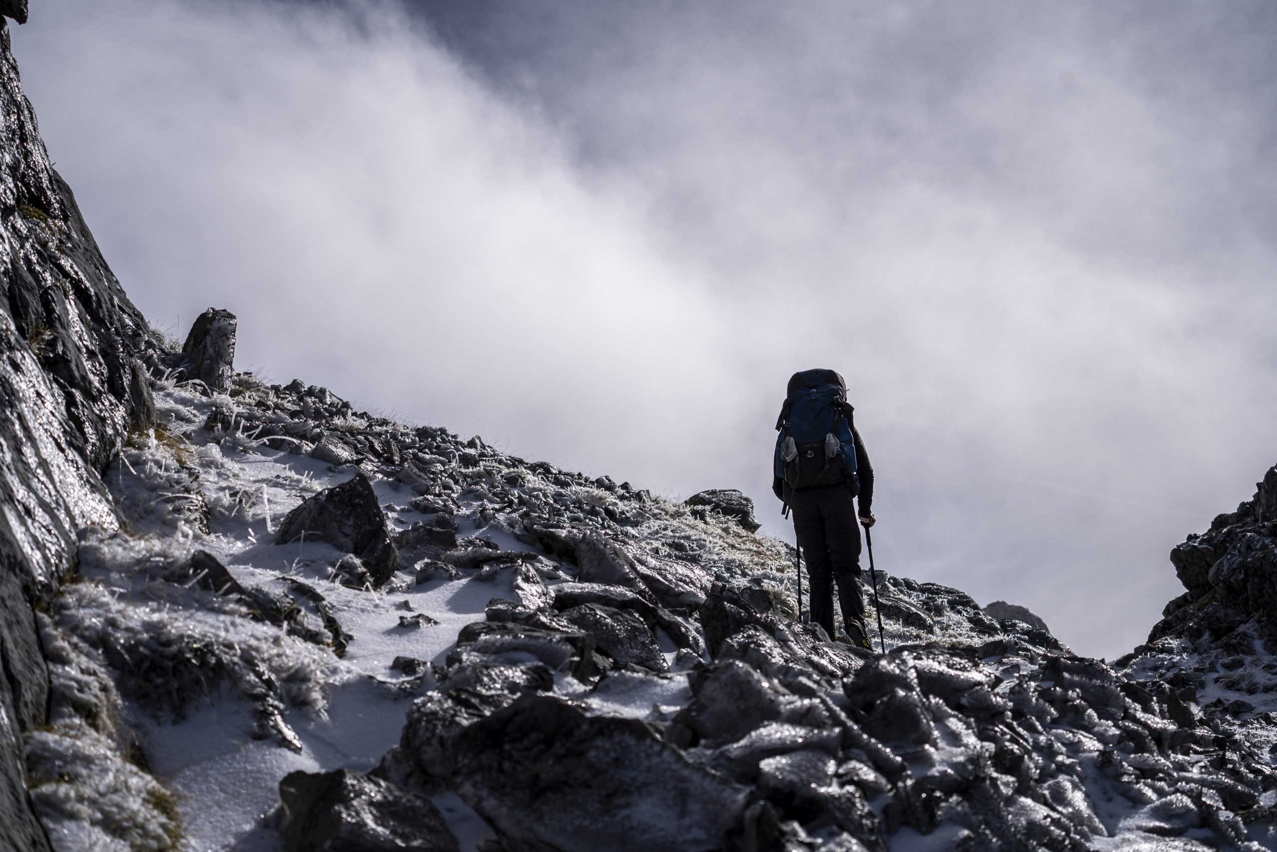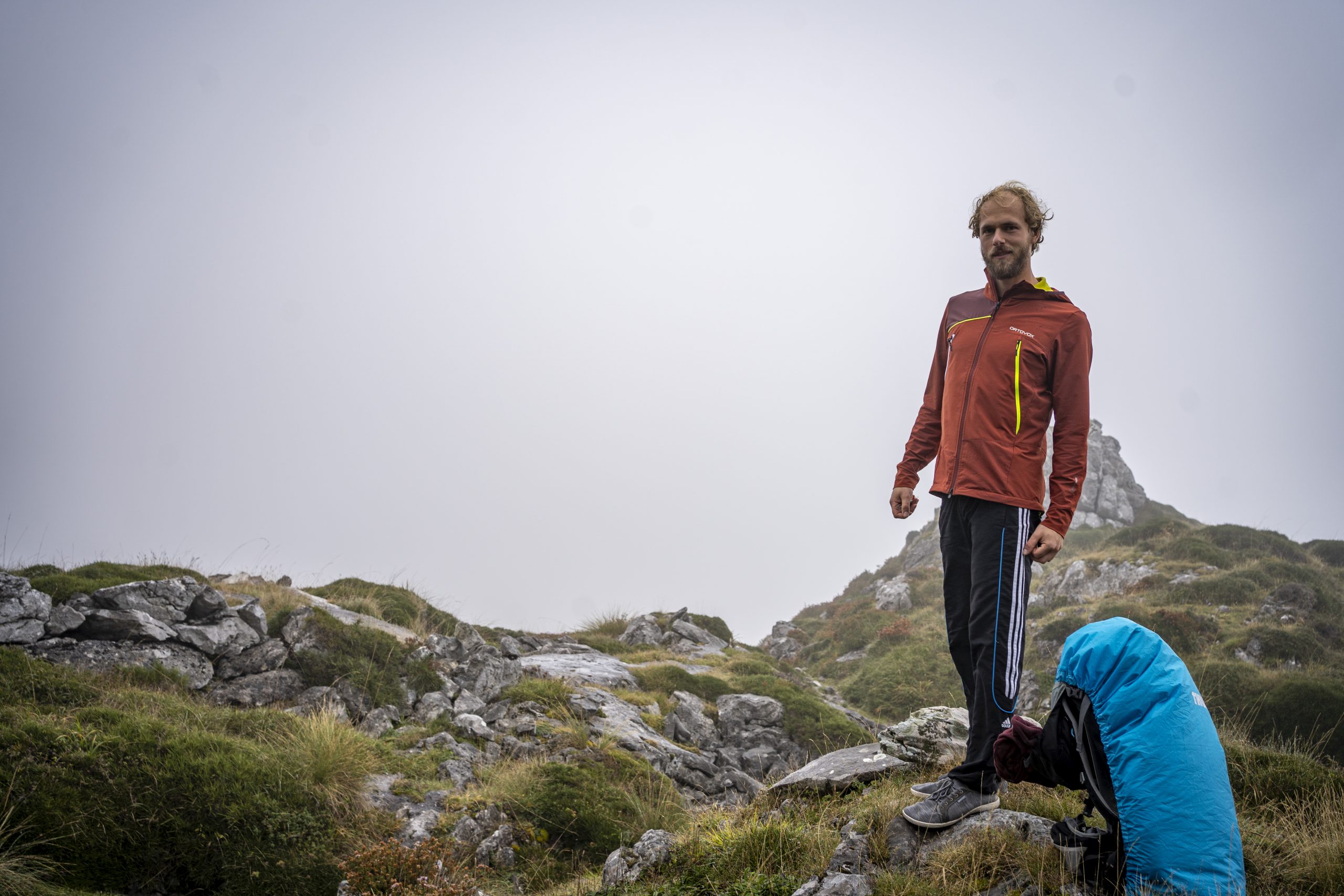 Am Morgen darauf wurden wir von klarer Sicht überrascht, die wir direkt ausnutzen wollten. Ohne Frühstück im Bauch ging es direkt 600m steil nach oben. Das Terrain wurde steiniger, die Plateaus, die noch grün waren, waren von kleinen Kratern übersäht, die aussahen, als wären die Wasserreservoirs und Tunnel im Berg sehr lebendig. Als dann irgendwann nur noch Stein und Eis zu sehen war, hatten wir glücklicherweise auch endlich eine Höhe erreicht, von der die Sonne zu sehen war. An einer Höhle war ein hübscher Ort für unser Porridge. Ein optimistischer Blick auf die Karte: Ab hier eigentlich keine Steigung mehr und nach 8km dann noch 1000 Höhenmeter nach unten. Doch was auf der Karte wie eine große Ebene aussieht, stellt sich bald als eine ziemlich anstrengende Kletter-Wanderung heraus.