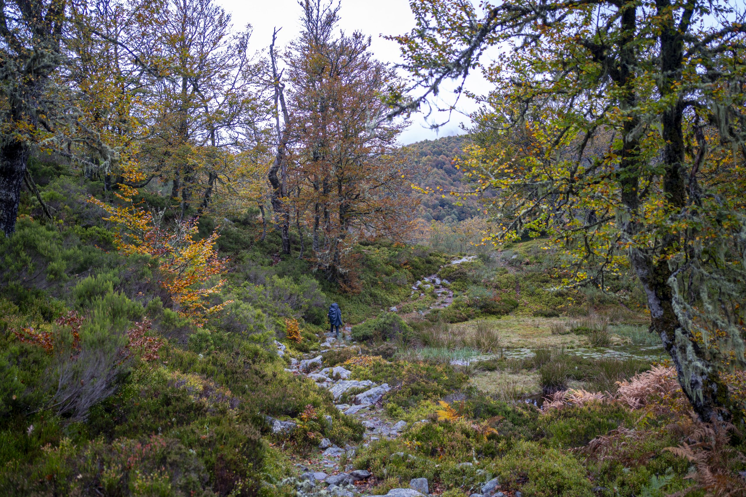 Der nächste Morgen versprach leider kaum Besserung. Obwohl unsere Schuhe noch so nass wie am Abend zuvor waren, warteten wir den morgendlichen Regen ab und brachen erst gegen 11 auf. Es war noch immer sehr kalt und grau, aber die Sicht war besser und dank des herbstlichen Wetters manchmal sogar farbenfroh. Als Zwischenziel standen 2 Seen auf der Routenplanung, die zwar kilometerweise ein Umweg zum nächsten Refugio waren, jedoch einen deutlich gangbareren Weg vorzuweisen haben sollten. Der ein oder andere Ausrutscher im Matsch ließ sich leider trotzdem nicht vermeiden. Im nächsten Refugio, das wir nach 530m Auf und 960m Ab bei Nieselregen erreichten, war zu unserem Glück der Kamin an. Zwei andere Wanderer waren mit uns zu Gast. Platz war in der großen Hütte sogar für 50 Leute. Es gab die Möglichkeit zu Essen aber wir entschieden uns selbst zu kochen, um etwas Gewicht loszuwerden.