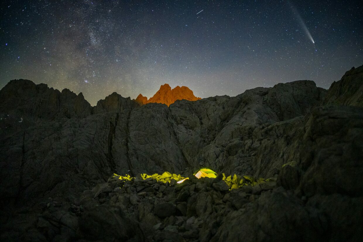 Die Cabaña erinnerte von außen stark an eine SciFi Hütte von einem entfernten Wüstenplaneten und von innen an ein beheiztes U-Boot aus dem kalten Krieg. Woher die Wärme und die hohe Luftfeuchtigkeit kam, konnten wir uns nicht erklären, da keiner da war. Doch obwohl das kompakte 3-Stockbett Platz für 6 Personen bieten soll, waren wir uns schnell einig, dass wir das Zelt bevorzugen. Wir kochten und aßen windgeschützt unter einem atemberaubenden Sternenhimmel, in dem bis zum Mondaufgang sogar noch der Komet Tsuchinshan-ATLAS gut sichtbar war.