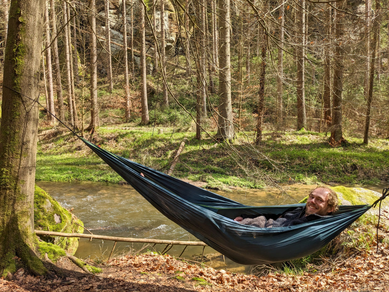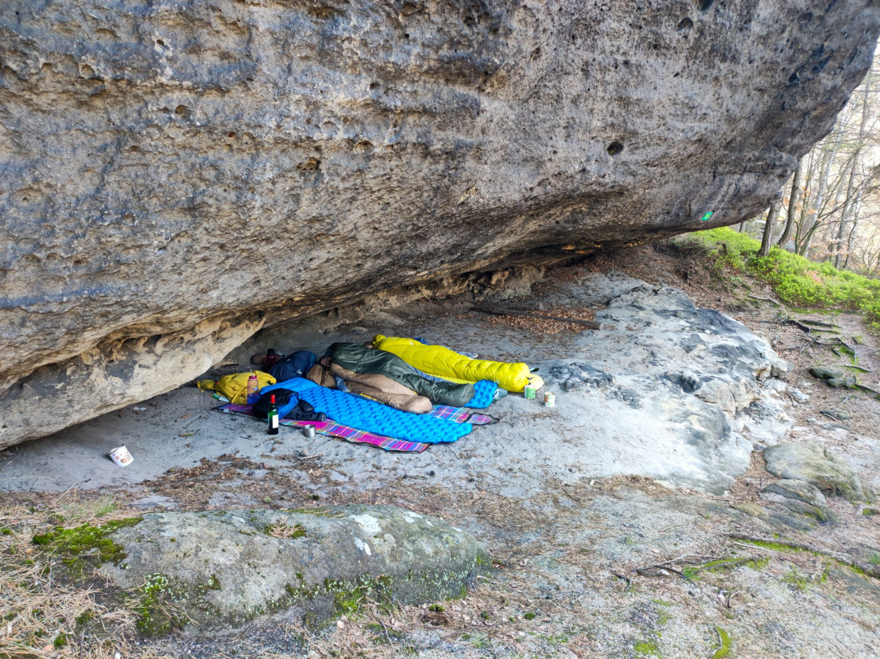 Glücklicherweise hatten wir noch einige sonnige Tage, an denen der Wald, wo er es konnte, frühlinghaft lebendig wurde. Zum Boofen (=Nächtigen in einer Boofe (= Höhle unter Felsüberstand)) ergab sich auch noch die Gelegenheit, genauso wie für einen malerischen Sonnenuntergang.