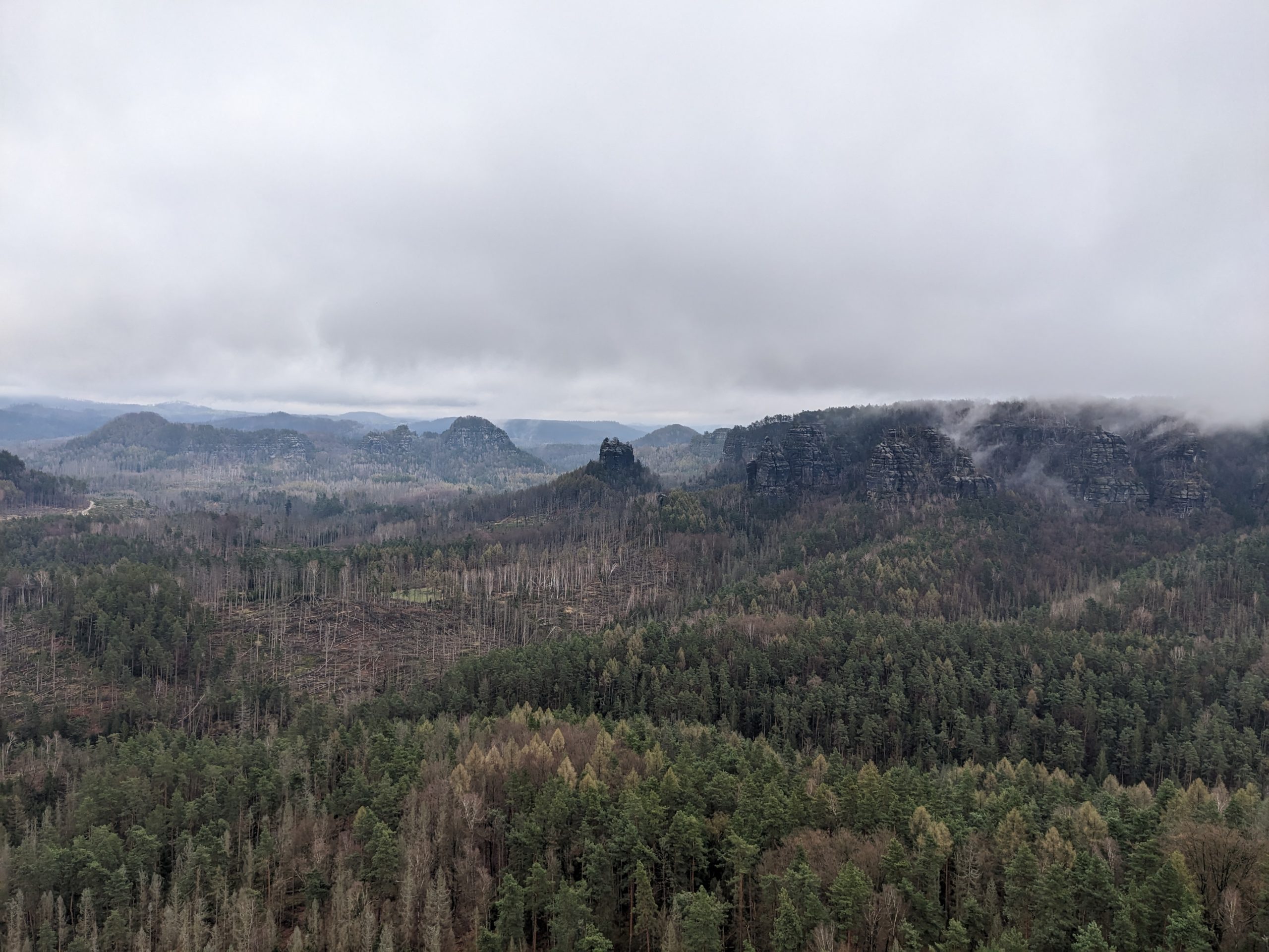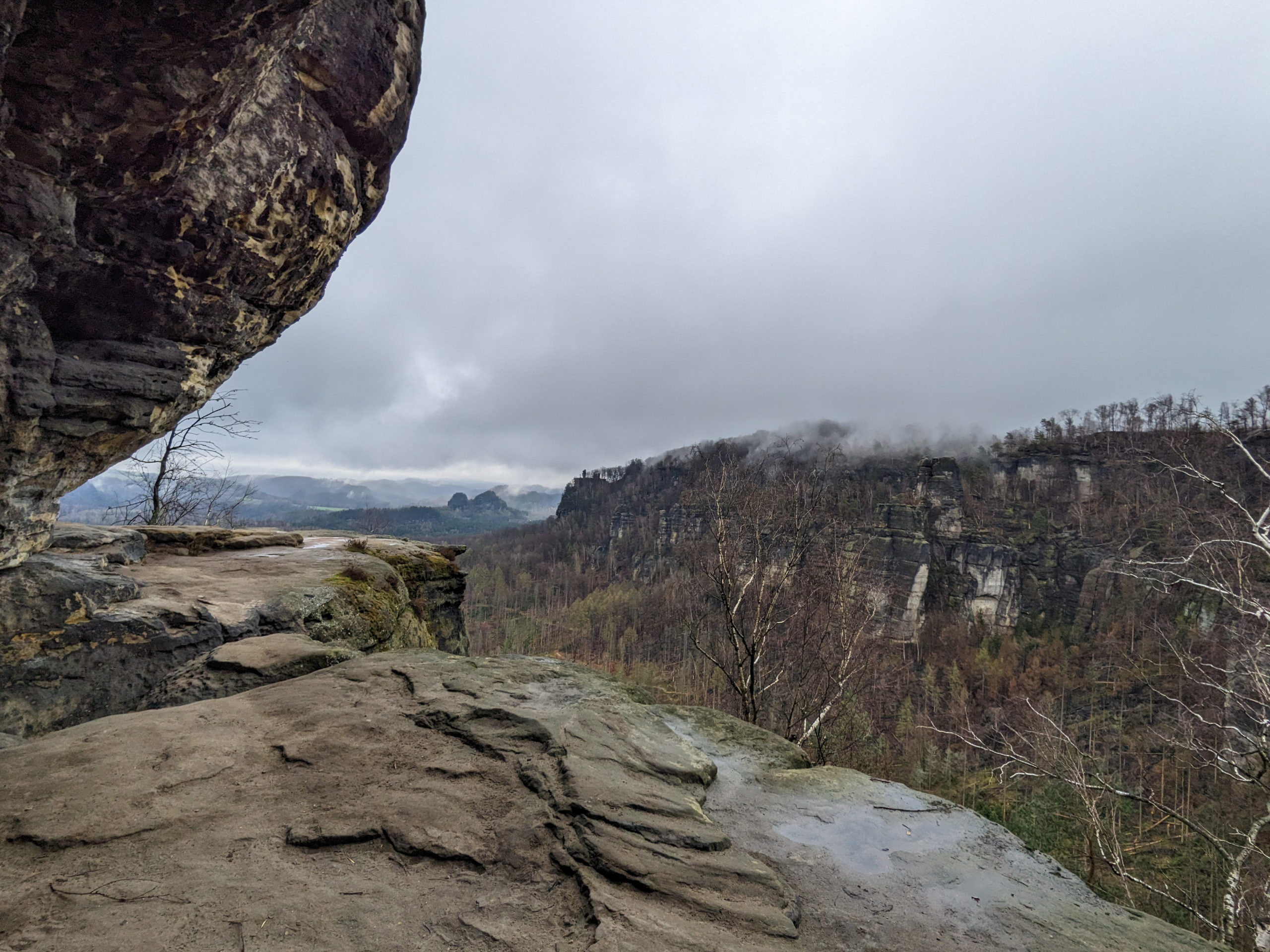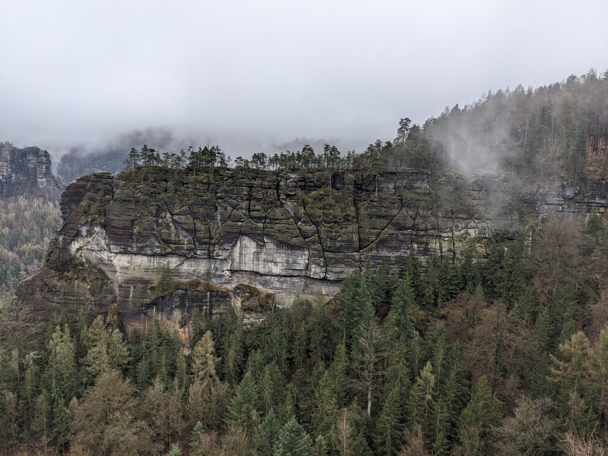 Wie vermutlich auch Casper David Friedrichs Wanderer über dem Nebelmeer mussten auch wir erstmal durch das Nebelmeer hindurchtauchen, bevor wir (manchmal) mit einer Aussicht in die Ferne belohnt wurden. Doch auch ohne Fernblick ist eine Wanderung durch die hintere Sächsischen Schweiz wegen der malerischen Wege, eindrucksvollen Felsformationen und soaßigen Kletterpasagen sehr empfehlenswert.