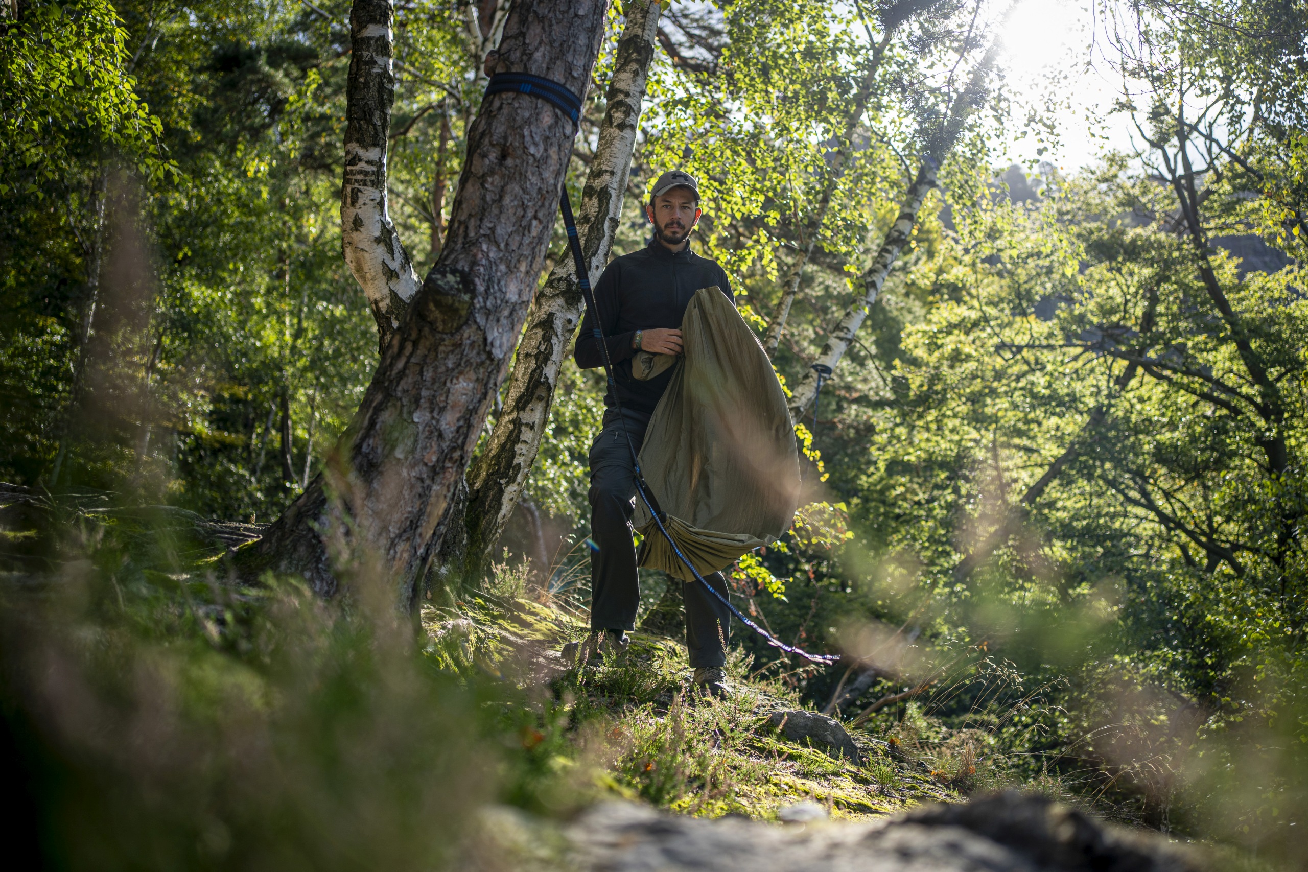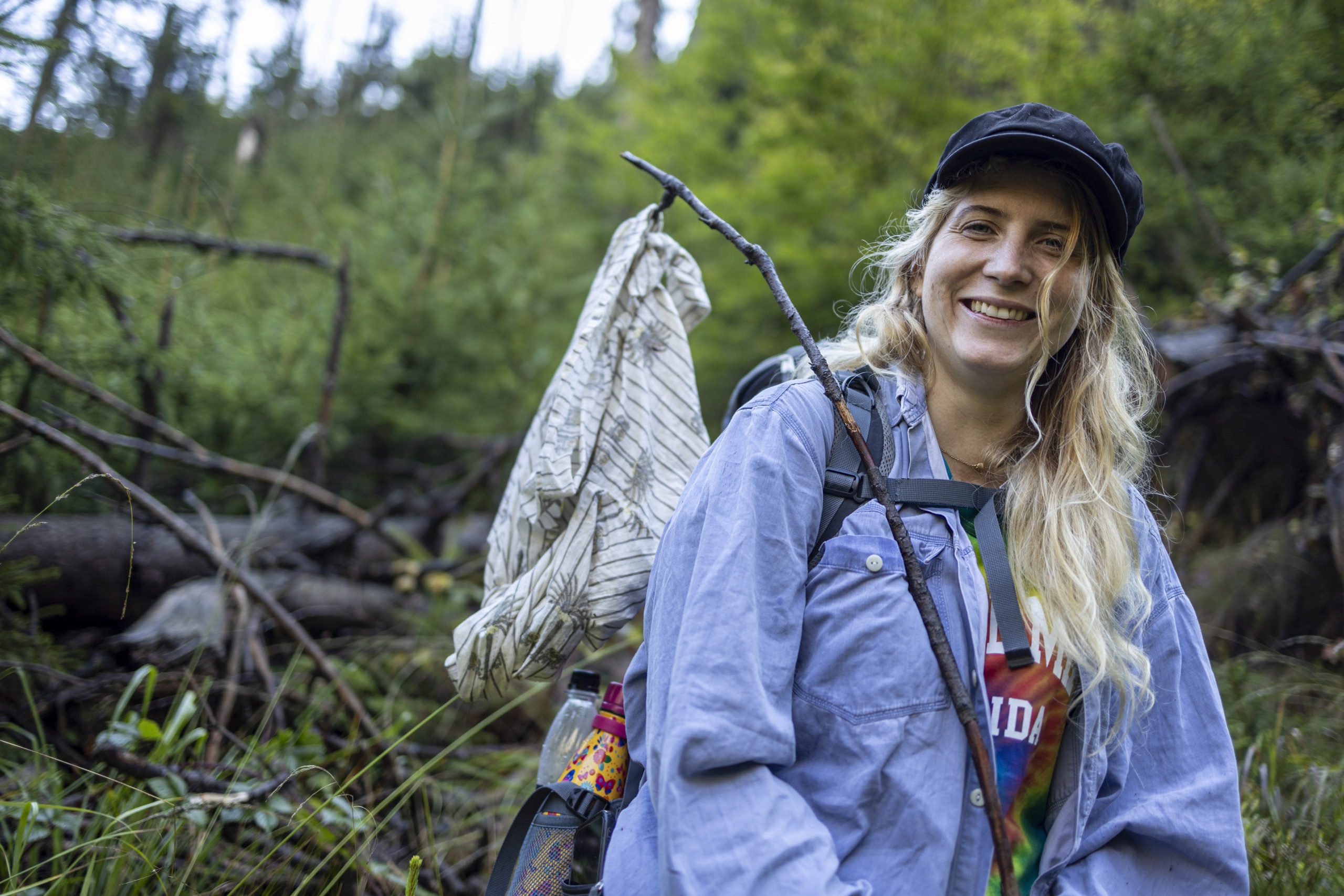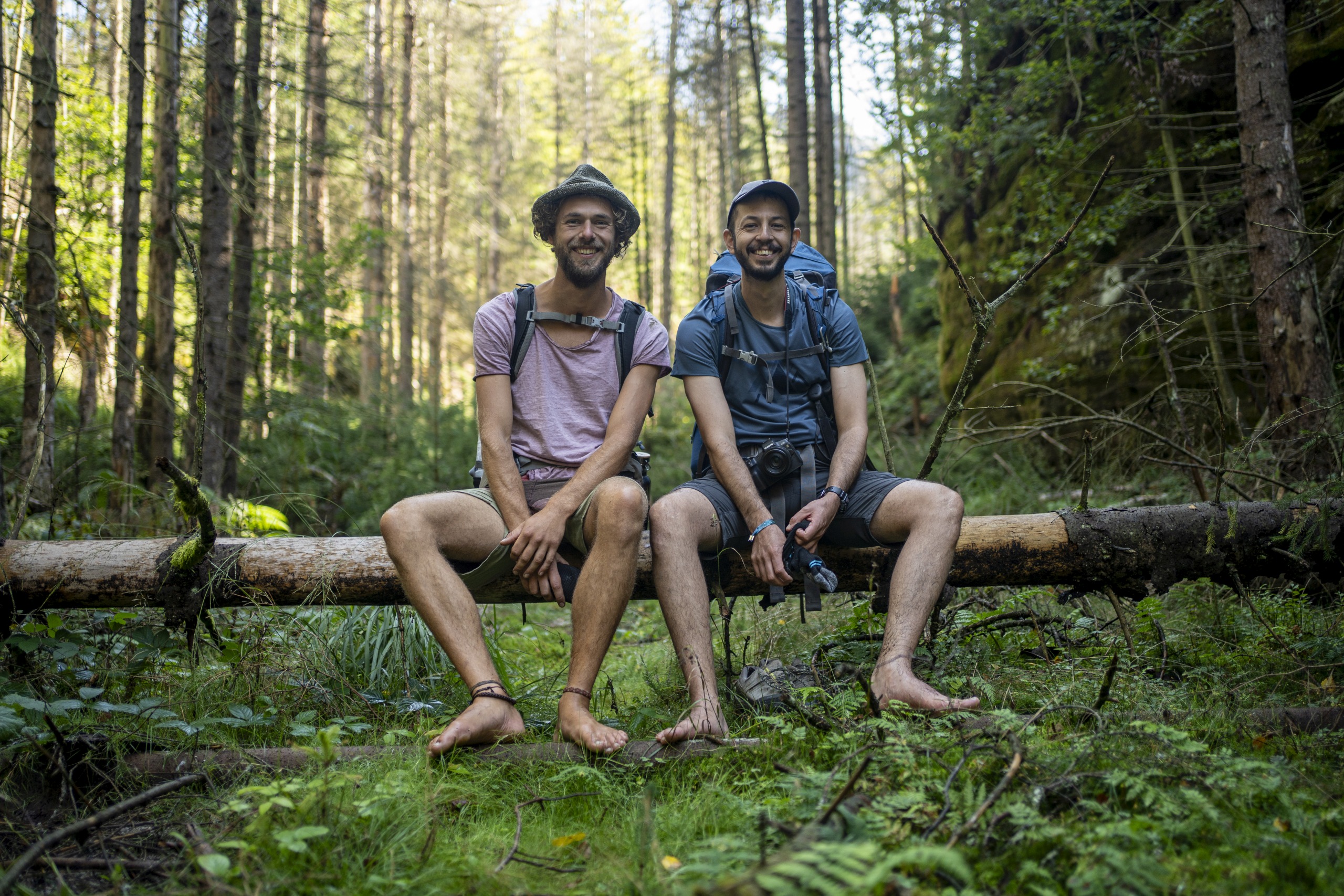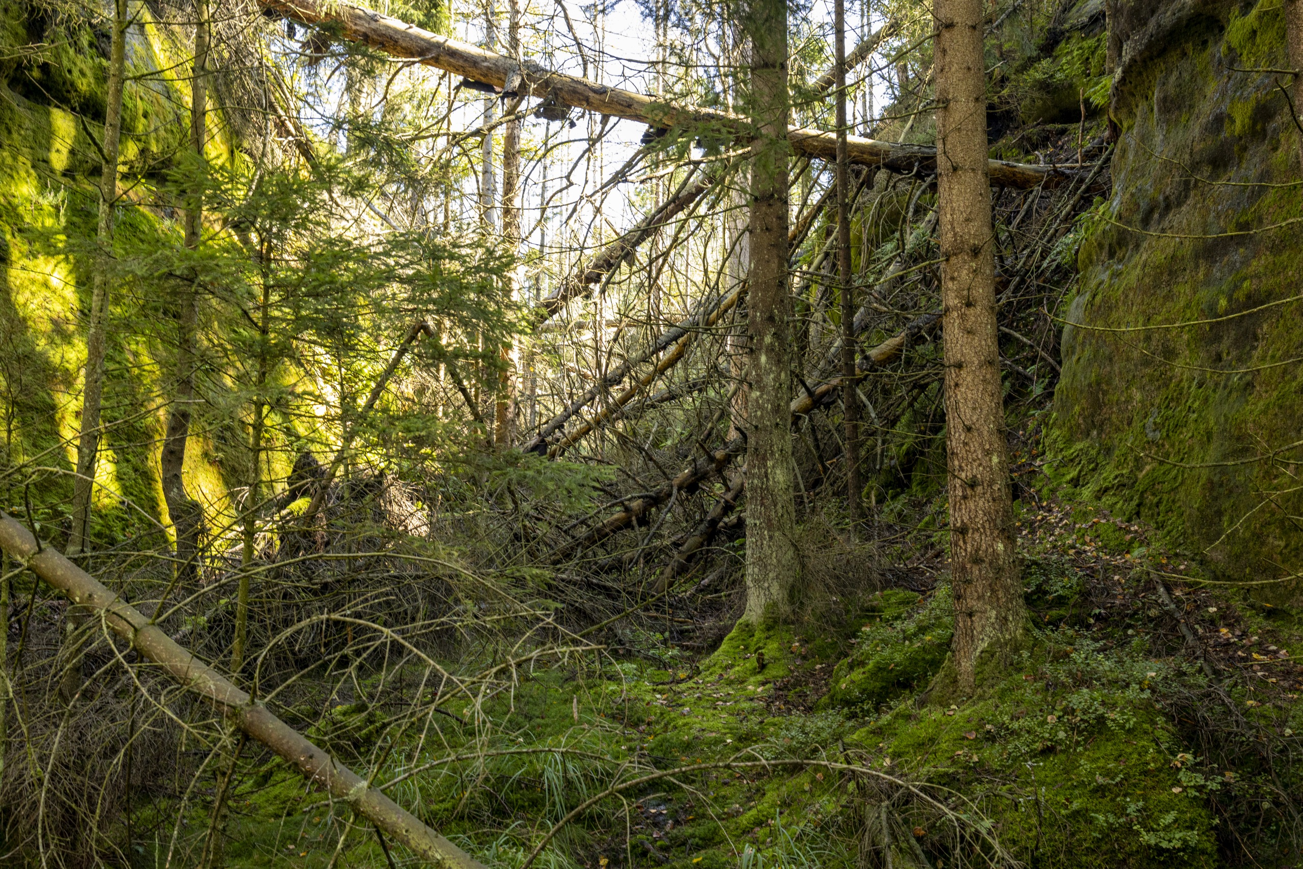 Der nächste Tag führte einem eindrücklich die Schönheit der Vergänglichkeit und des Wandels vor Augen. Es ging durch dichtes Unterholz, welches durch die vielen umgestürzten Bäume kaum zu bezwingen war. Ohne GPS und Karte hätte auch keiner von uns vermutet, dass dort ein Pfad entlangführt. All die gefallenen Fichten sind vermutlich von Borkenkäfern befallen gewesen. Der Schädlingsbefall betrifft vor allem aufgeforstete Monokulturen und wird durch milde Winter begünstigt. In der Region wird das Totholz seinem Schicksal überlassen, weshalb die Stämme wie Mikadostäbchen kreuz und quer in der Landschaft liegen. Das freut die Pilze und begünstigt schnellen, vielseitigen Nachwuchs. Andererseits erhöht es auch die Brandlast, was 2022 zu großen, schwer kontrollierbaren Bränden führte. Mit dieser Tragödie im Hinterkopf war ich positiv überrascht, wie vielfältig und gesund der junge Wald beim Durchwandern auf mich als Laien wirkte. Wir empfanden ihn als wunderschönen Ur-Dschungel voller Potential und Lebensenergie, was kein Foto so hätte darstellen können.