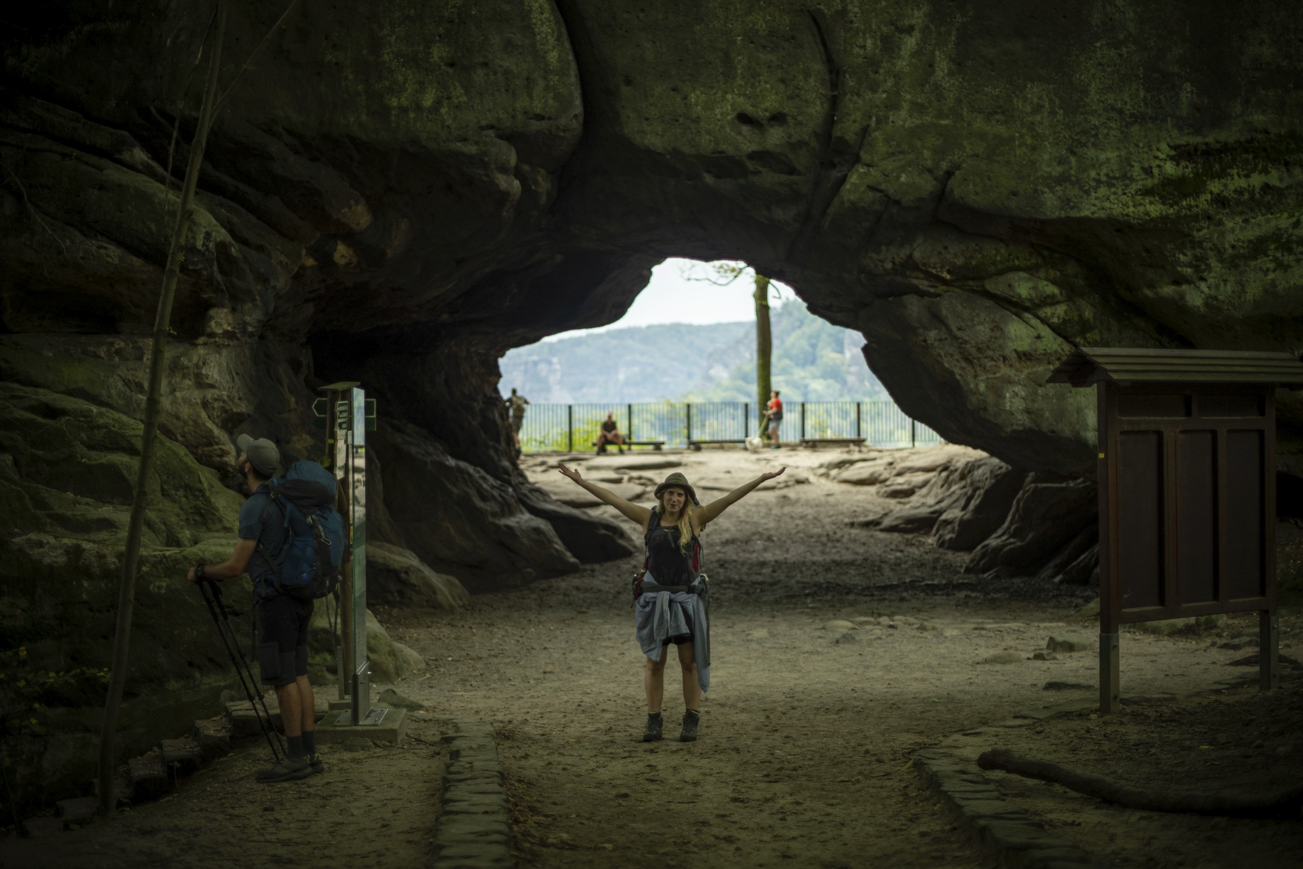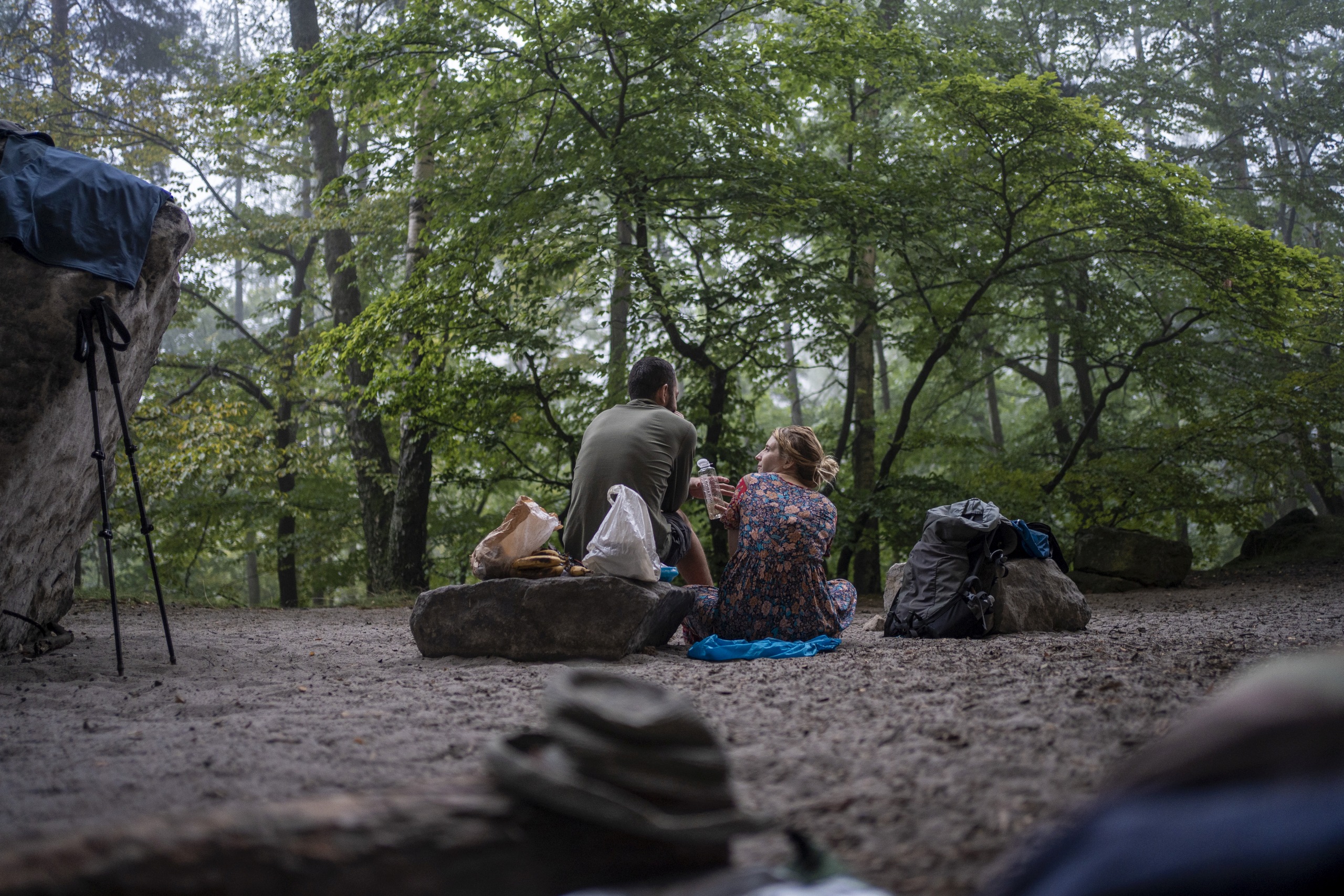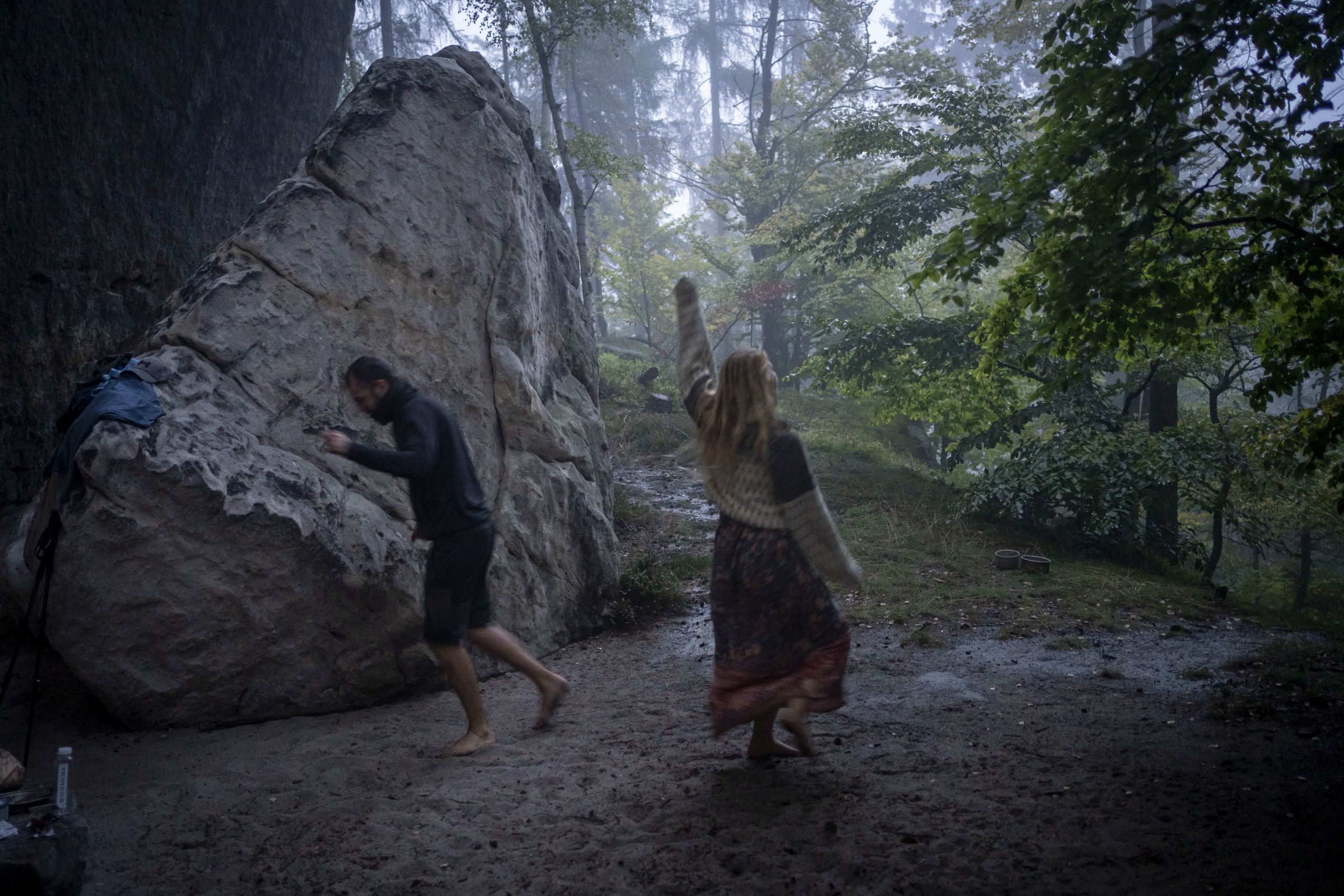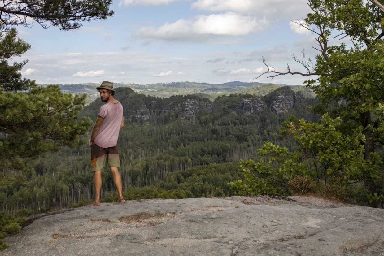 Gut gestärkt ging es weiter durch märchenhafte Wälder und Felsformationen, die sich keiner ausdenken kann. Ich liebe die sächsische Schweiz dafür, dass man zu keinem Zeitpunkt das Gefühl hat, hier wäre etwas von Menschen angelegt. Die Natur hat ihre chaotische Schönheit voll entfaltet und kein Ort gleicht dem Nächsten. Als es gegen Abend wieder zu regnen begann, hatten wir auf 500m gleich 3 mögliche Boofen zu besichtigen. Wir entschieden uns für die größte, die gar nicht wirkt wie eine Höhle, weil ihr Vorsprung wie ein kolossaler Schiffrumpf über uns ragt. Darunter hatten wir genug Platz, um im trockenen Sand einen Regentanz zu tanzen und zu kochen.