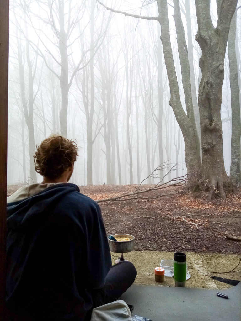 Als wir Unterschlupf in einem Rifugio fanden, in dem bereits ein anderer Hund lebte, Ging Paolo weiter seines Weges. Das Pärchen, das das besagte Refugio betreibt, erzählte uns, ihr Hund geht auch gern mit fremden Wandern und lässt sich dann 40km weit von zu Hause wieder abholen. Die Gastgeber haben bei diesem Wetter und zu dieser Jahreszeit nicht mit Besuchern gerechnet, nahmen uns aber freudig auf. Die Nacht direkt vor dem Kamin nach einer eiskalten Dusche am großen Fenster mit Waldblick zu schlafen und morgens von einem Vogelkonzert geweckt zu werden, verfestigte meine zukünftigen Wohnpläne.