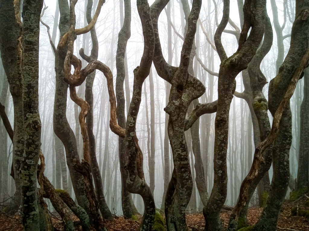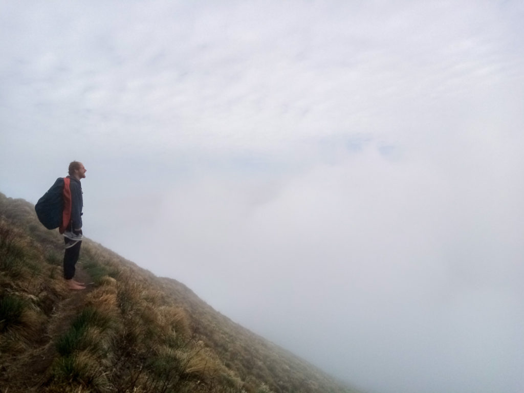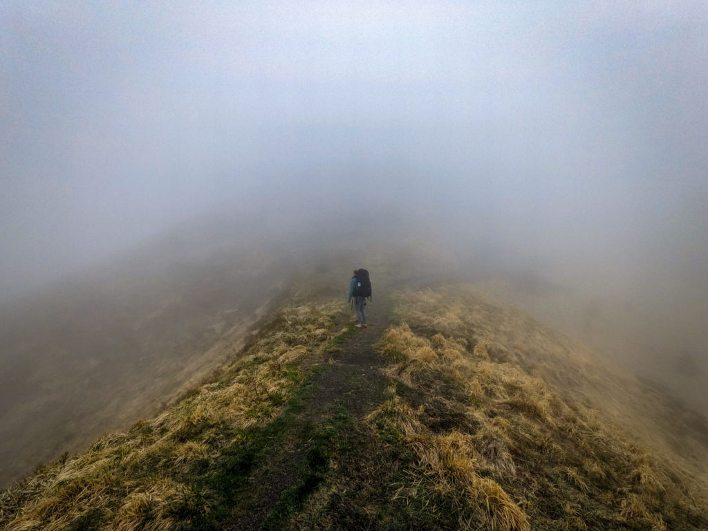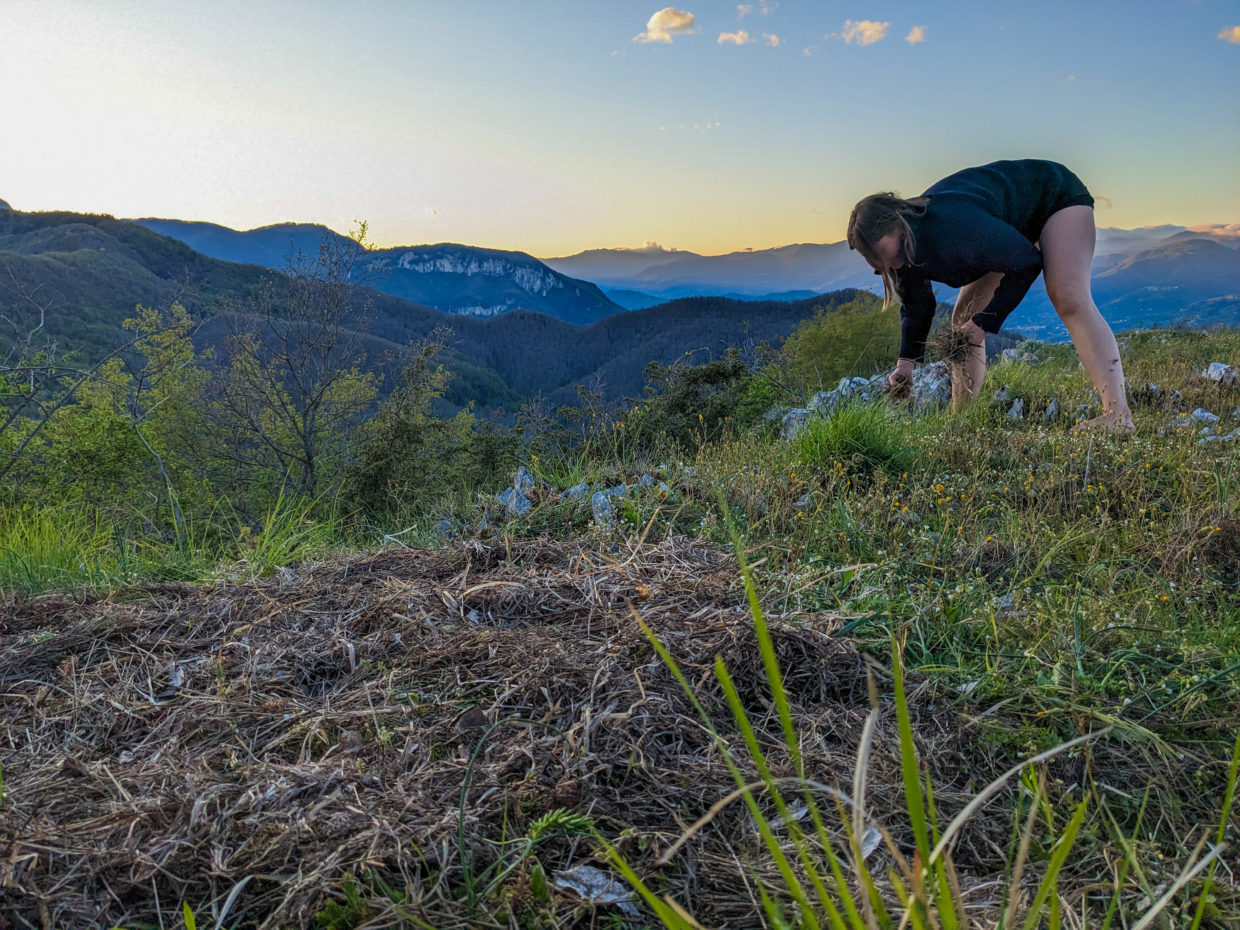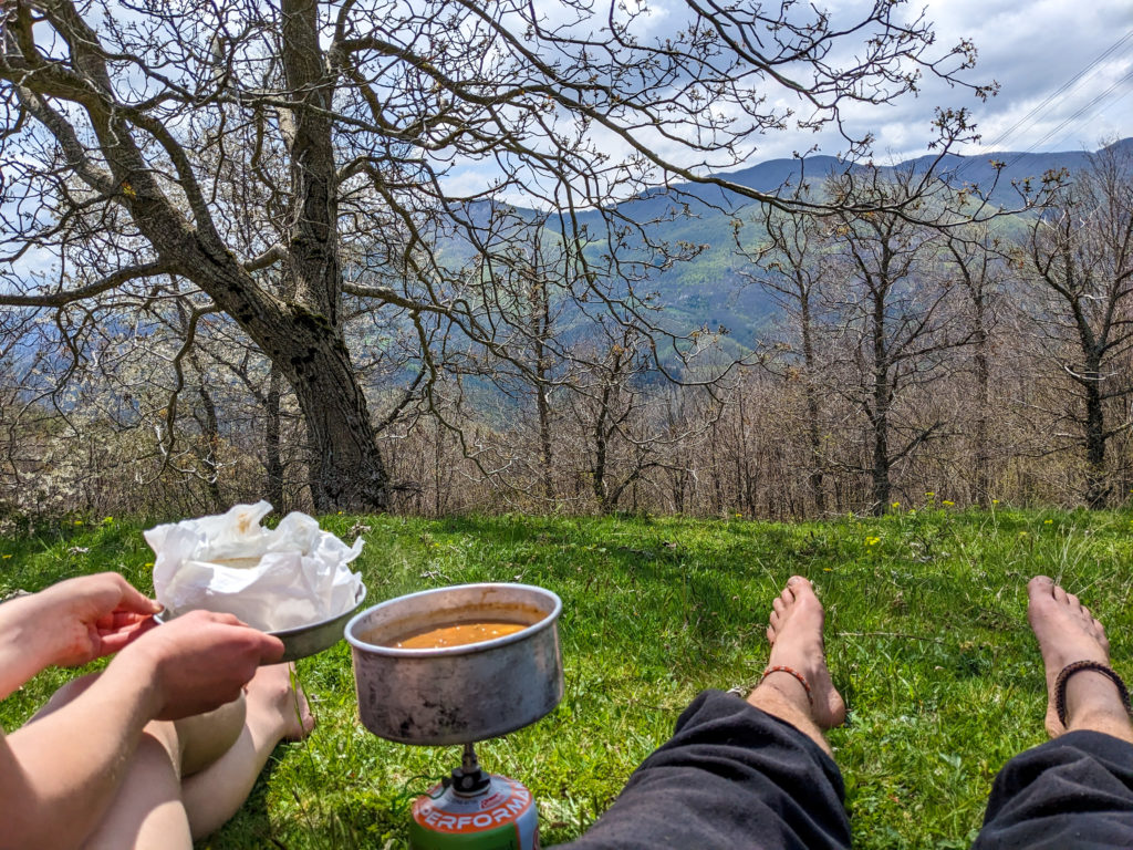 Die erste Wanderung zum Warmwerden. Nach einer kühlen, aber trockenen Nacht in den Hängematten sind wir erst aufgestanden, als die Sonne schön warm war. Am letzten Aussiedlerhof der Gegend begrüßte uns der weiße Goldie, den wir einfach Paolo nannten. Nun sind wir zudritt durch Kastanienwälder immer weiter bergauf gestiefelt. Die Wege lagen noch voller Maronen, was barfuß ein echtes Erlebnis ist. Meine Hornhaut war noch nicht bereit für diese dauerhaften Strapazen. Die Herbstgefühle wurden auch durch den leichten Nebel, das sehr hohe Laub und die kahlen Bäume weiter gestärkt. Der Wind war kalt und der*die Erbseneintopf*suppe zu Mittag deshalb genau die richtige Stärkung. Paolo hatte uns inzwischen mehrmals zu verstehen gegeben, dass er nicht weiter nach oben möchte. Wir verabschiedeten uns (mehrmals) aber alleine wieder runter wollte er auch nicht so recht. So war er nach spätestens 5 Minuten wieder bei uns. Ich versuchte ihm schwerenherzens klarzumachen, dass wir nicht sein Rudel sind, was er irgendwann zu akzeptieren schien. Dadurch war ich aber auch nicht mehr sein Alpha und er wurde frech.