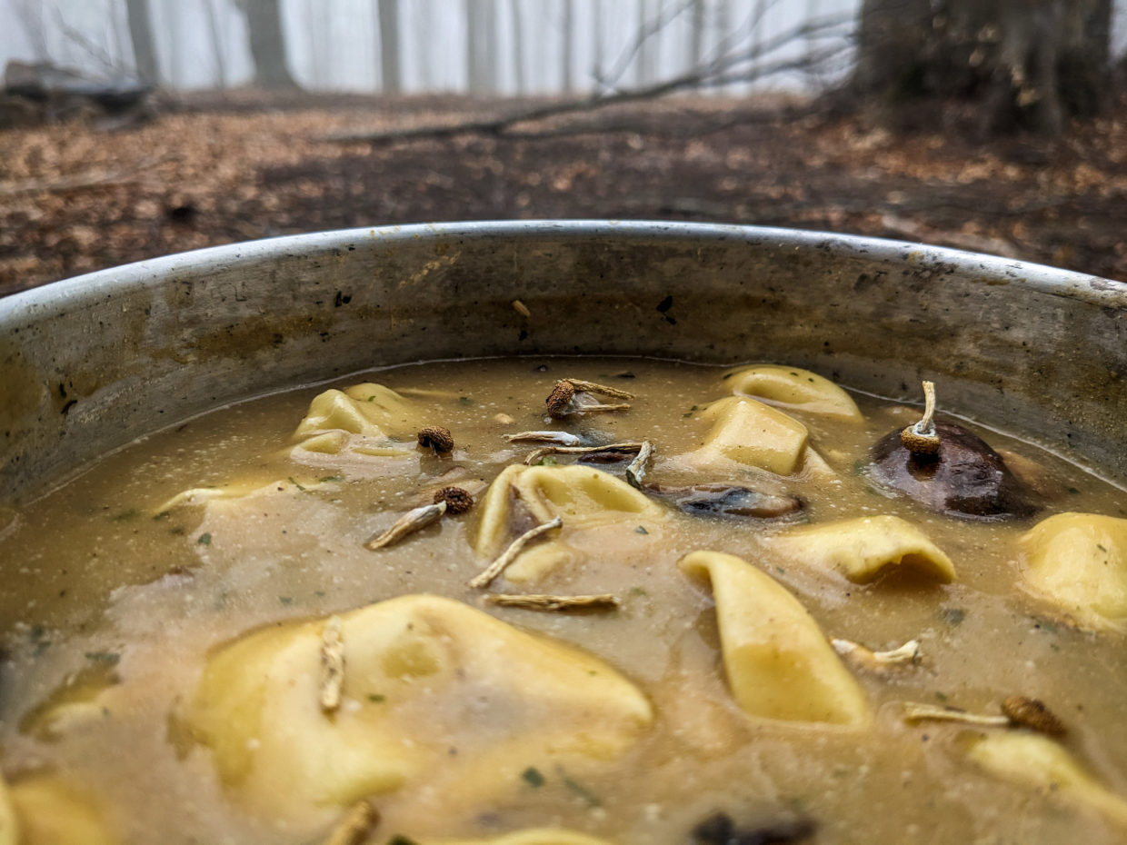 Wir hatten viel Proviant dabei, weshalb ich häufig auf eine Essenspause bestehen konnte. Einmal gab es eine Pilzsuppe mit Raviolieinlage, die wirklich sehr gut gelungen war. Aber der Appetit war auch wirklich groß. Auf dem weiteren Weg begannen die Bäume plötzlich zu tanzen und die Atmosphäre im Wald wechselte sehr häufig und extrem, sodass es einem vorkam, als wäre man durch mehrere Länder gelaufen.